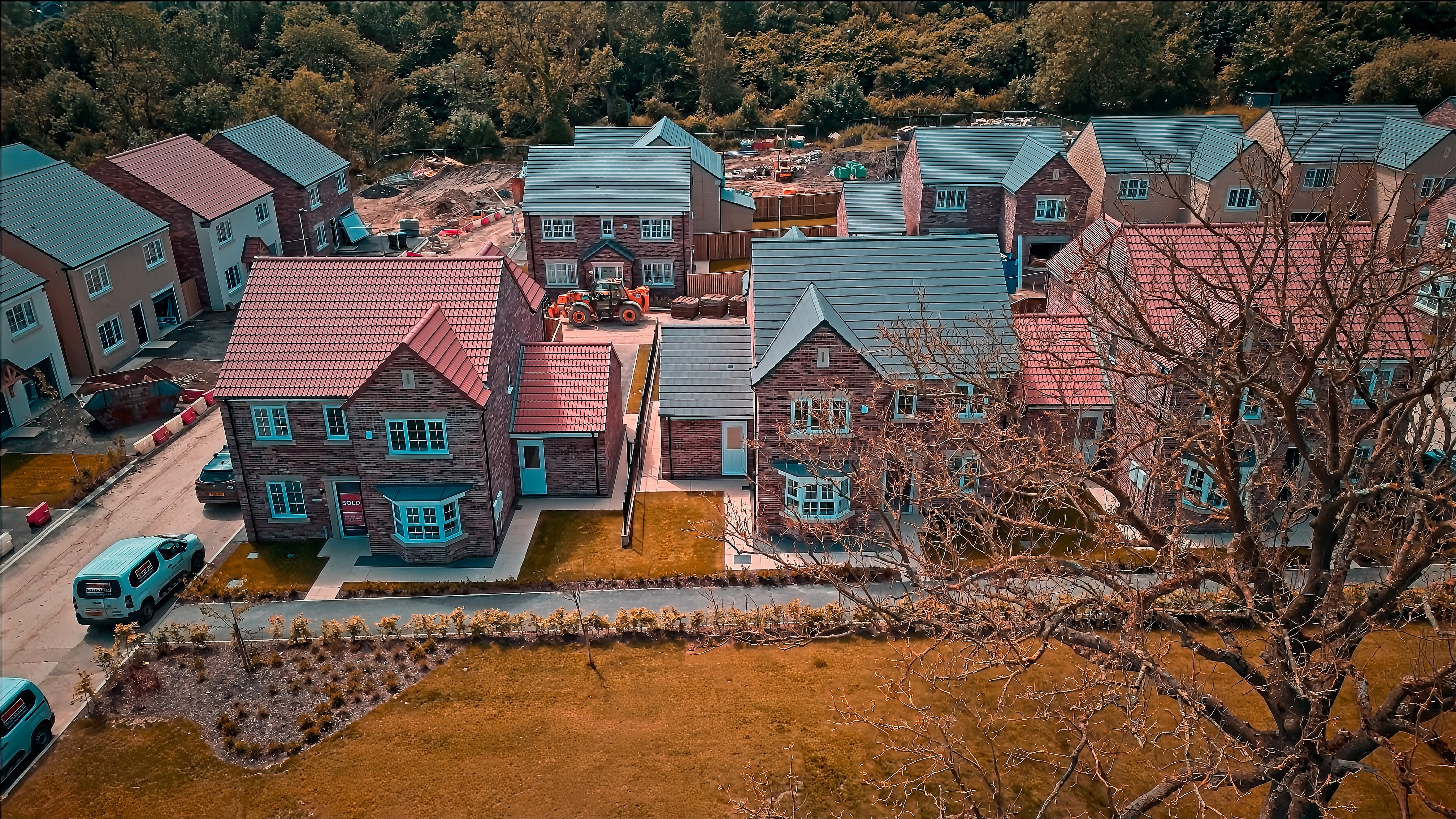 Aerial view of a suburban neighborhood with multiple houses, trees, and parked cars. The houses have brick exteriors and tiled roofs. The area appears to be under development with some construction visible.