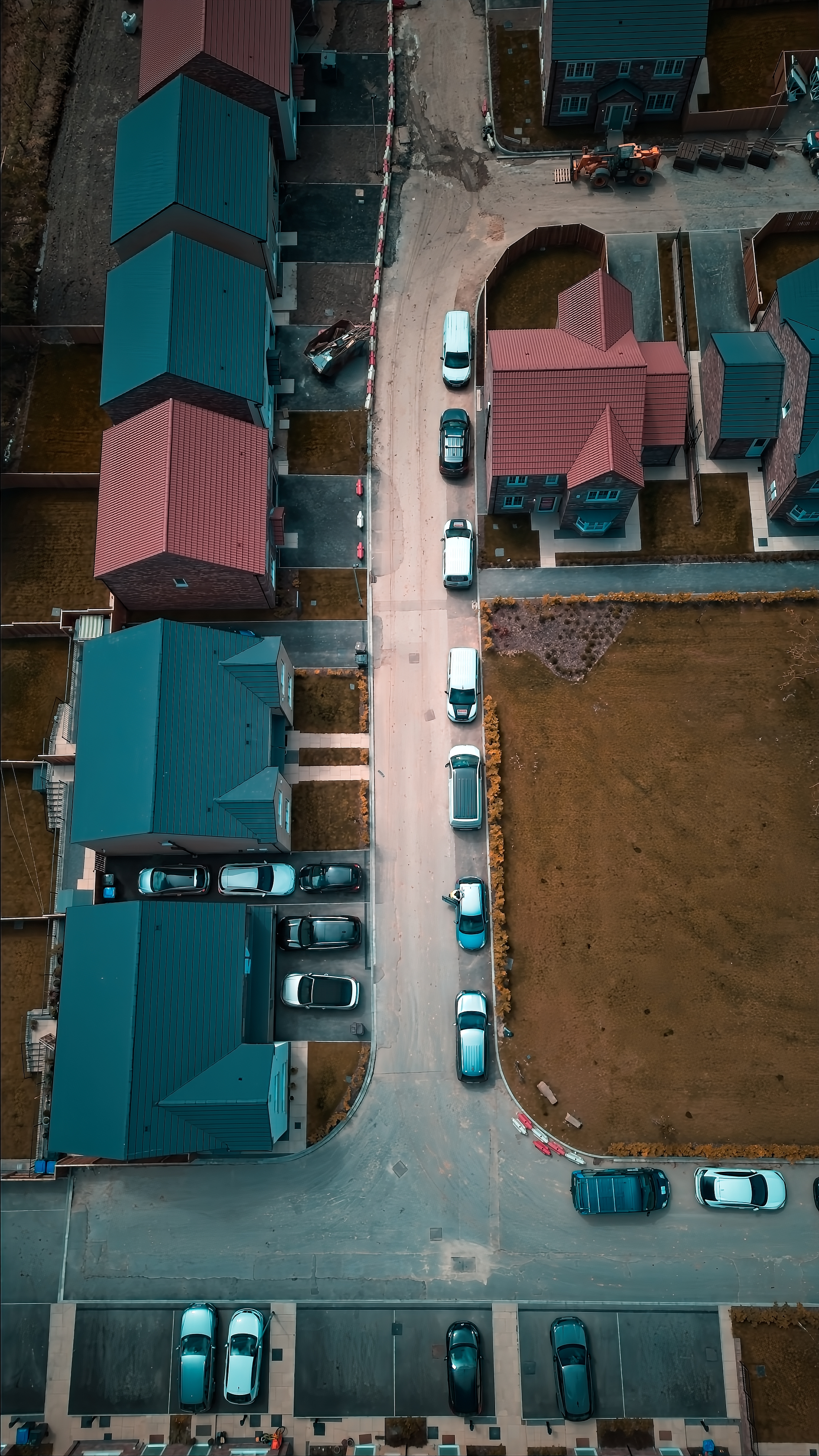 Aerial view of a suburban neighborhood with houses, parked cars, and a road. The houses have red and blue roofs, and the area appears to be under development.