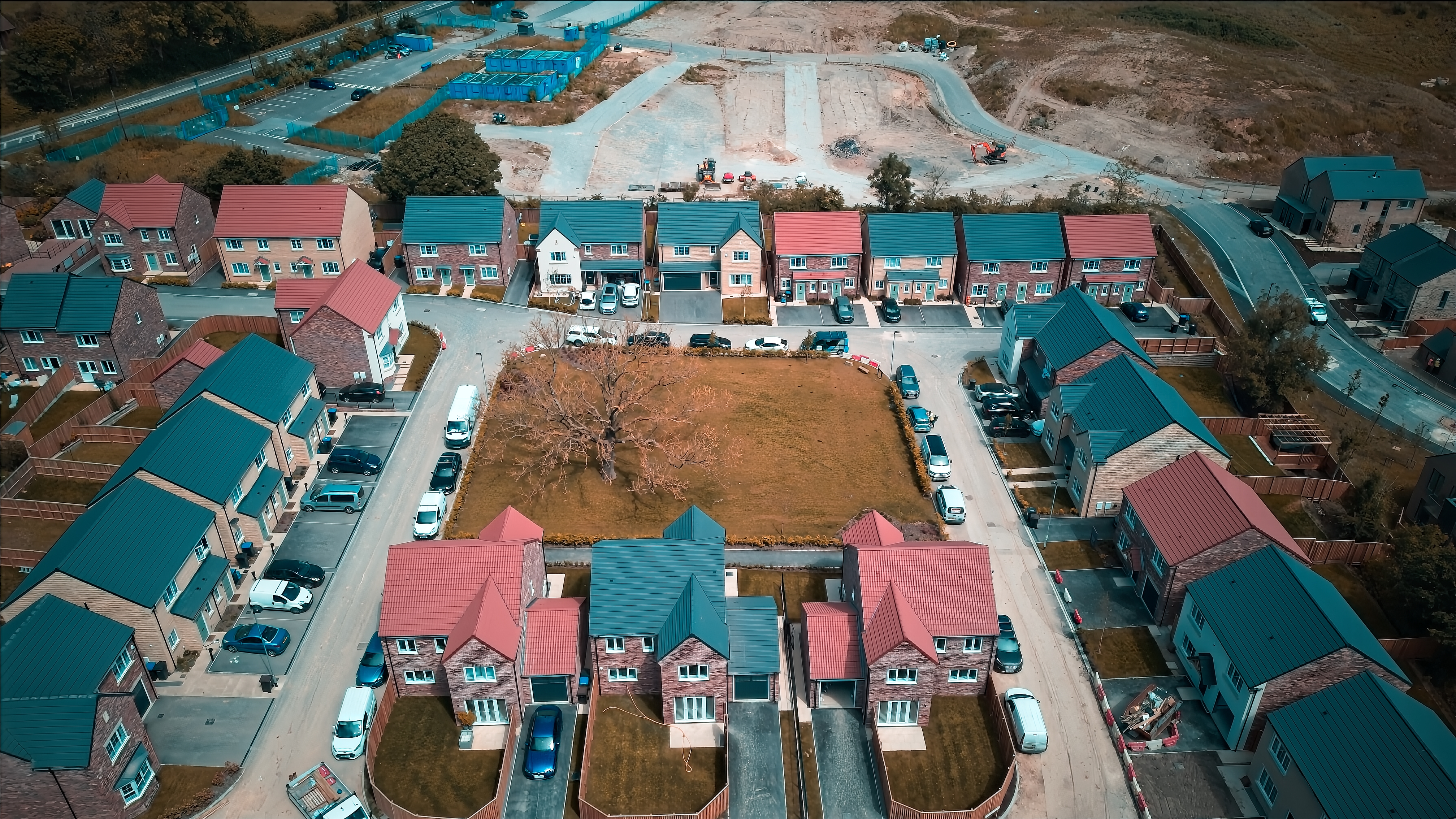 Aerial view of a suburban neighborhood with houses arranged around a central grassy area. The houses have red and gray roofs, and there are cars parked in driveways and on the street. Construction is visible in the background.