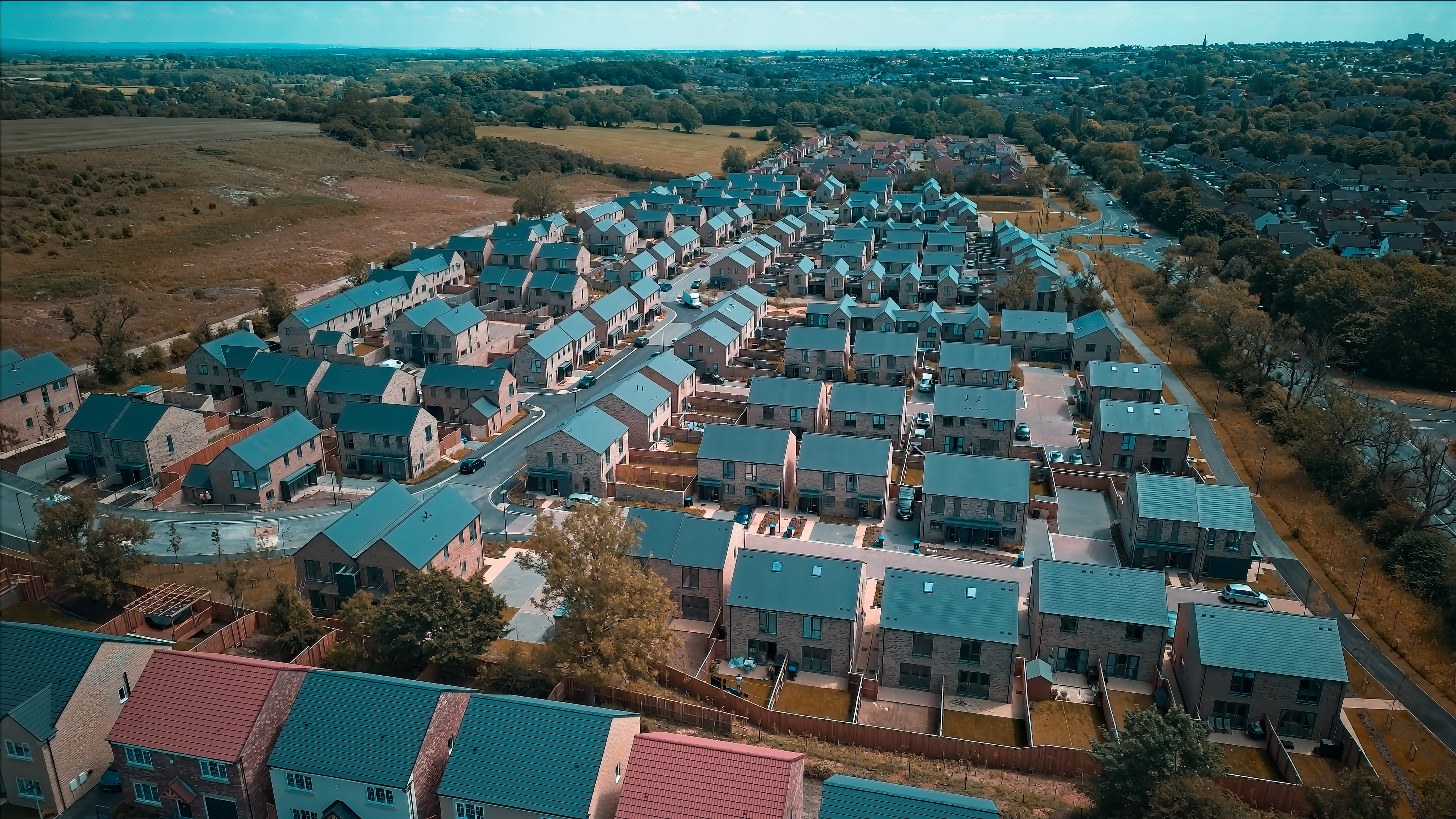 Aerial view of a suburban neighborhood with rows of houses, streets, and greenery. The houses have similar architectural styles and are closely packed together. The area is surrounded by open fields and trees.