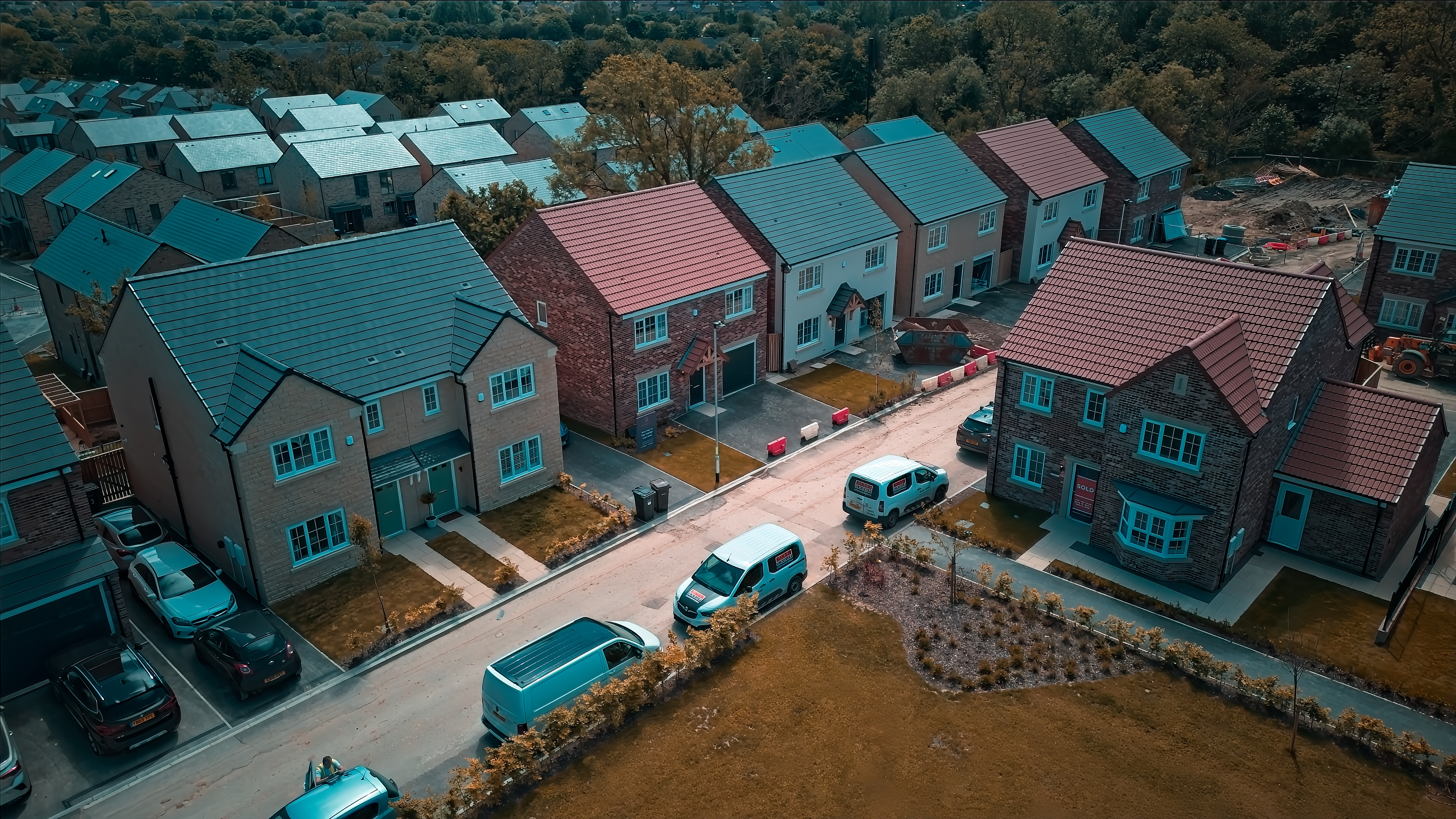 Aerial view of a suburban neighborhood with modern houses, cars parked in driveways, and a construction site in the background. The houses have different colored roofs and well-maintained lawns.