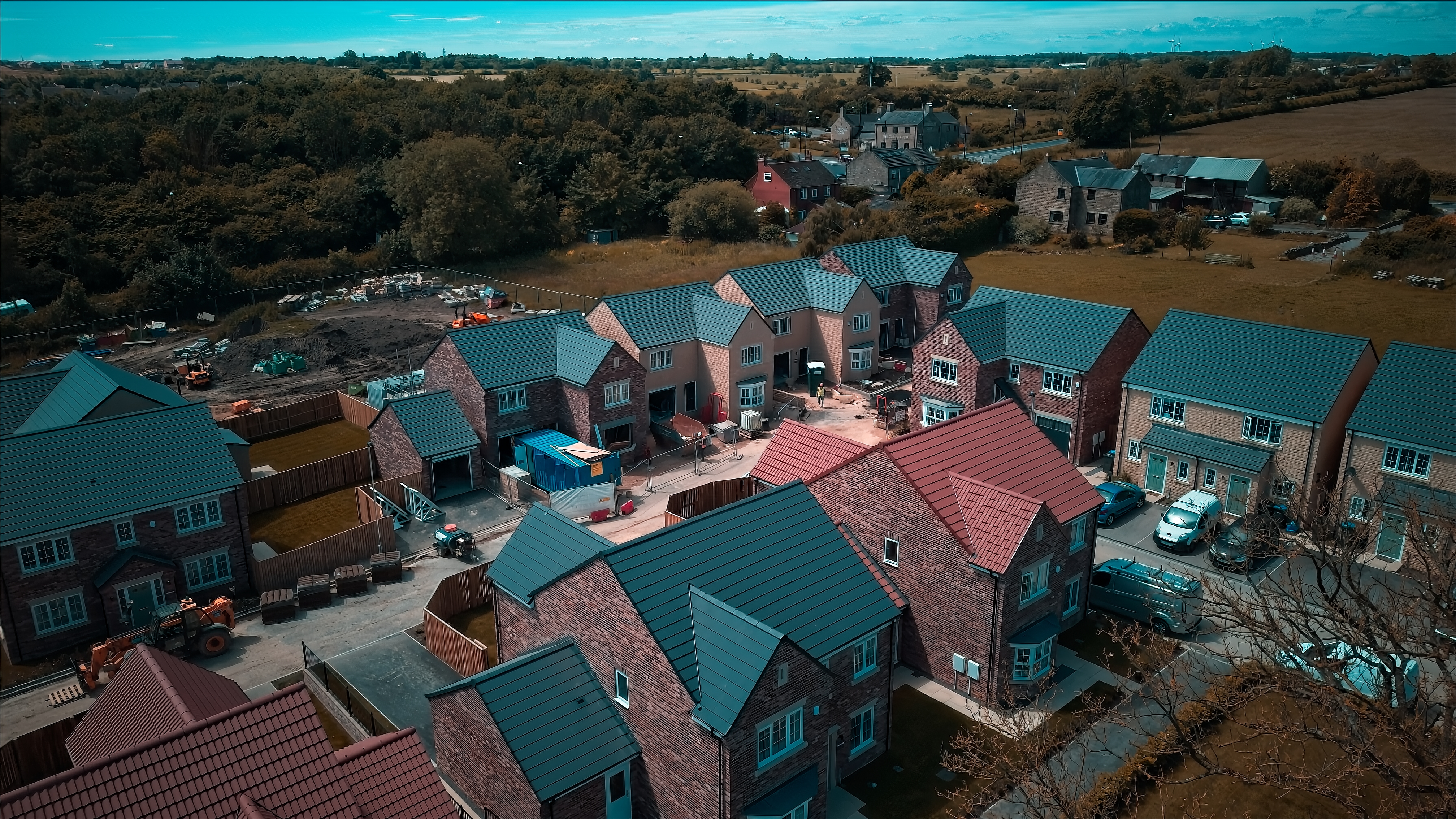 Aerial view of a suburban neighborhood with newly constructed houses, surrounded by greenery and fields. Construction equipment and materials are visible on some plots.