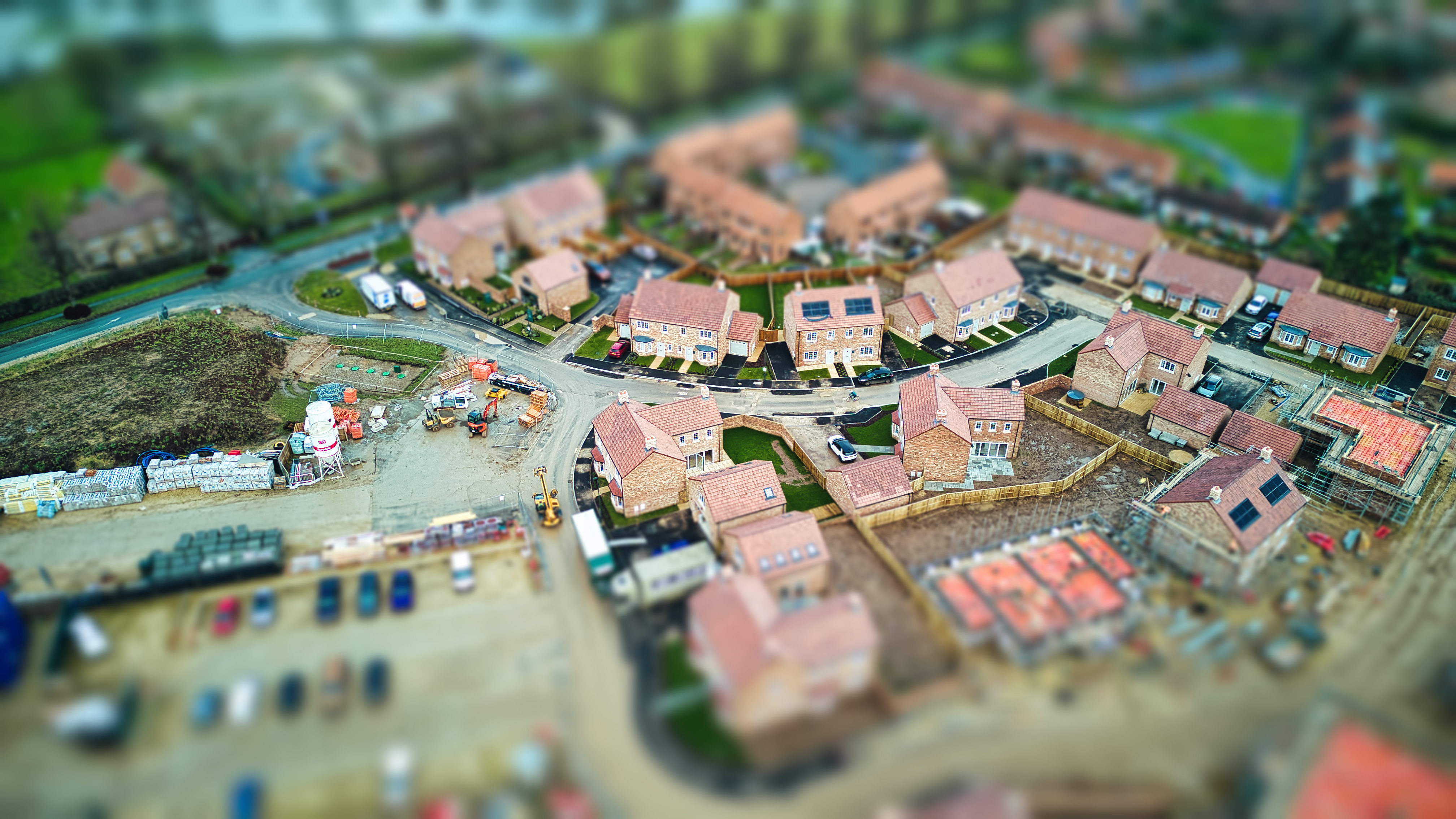 Aerial view of suburban neighborhood with tilt-shift effect, highlighting residential houses and construction area.