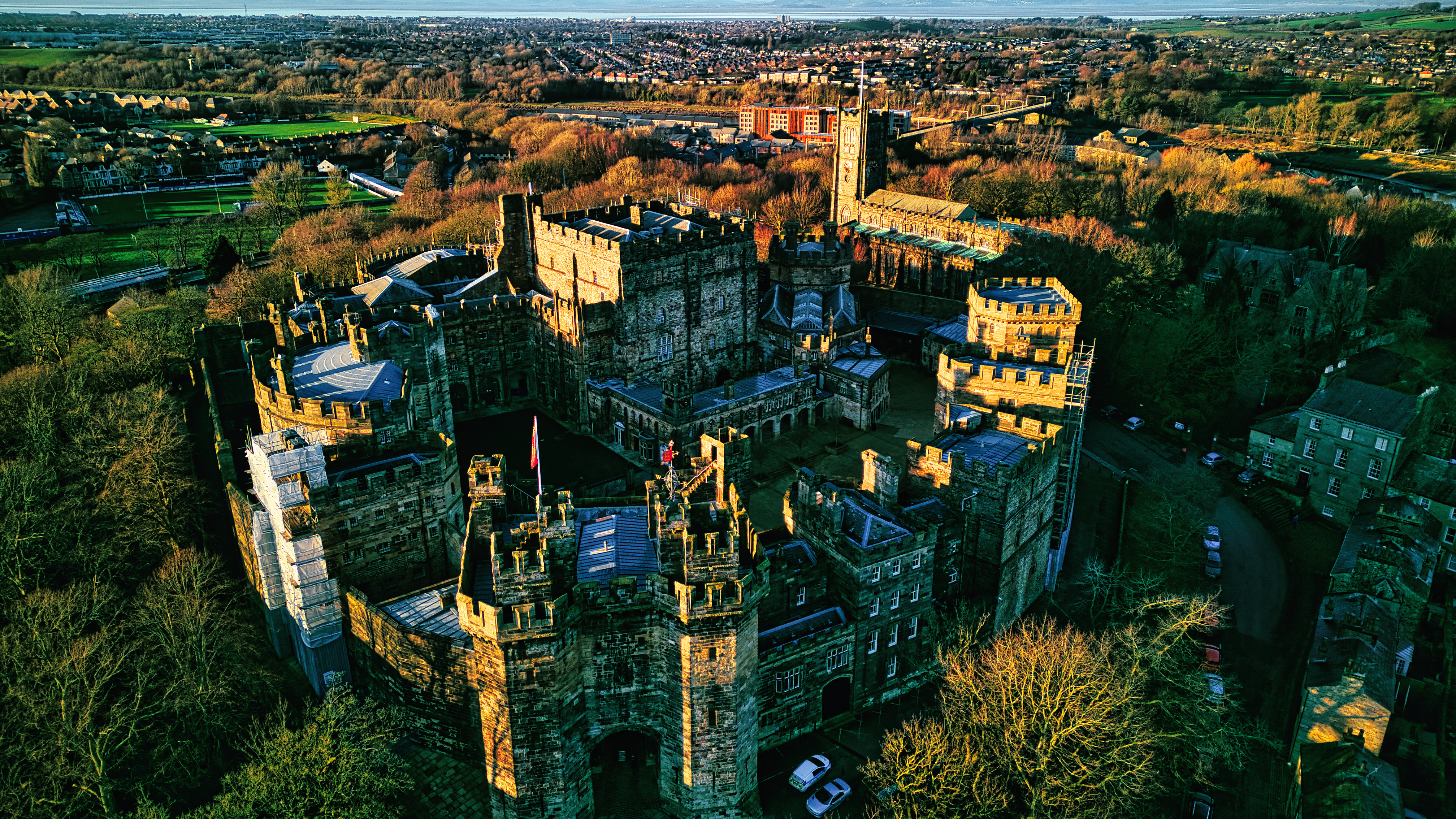 Aerial view of the Lancaster castle surrounded by lush greenery in a quaint town during sunset.
