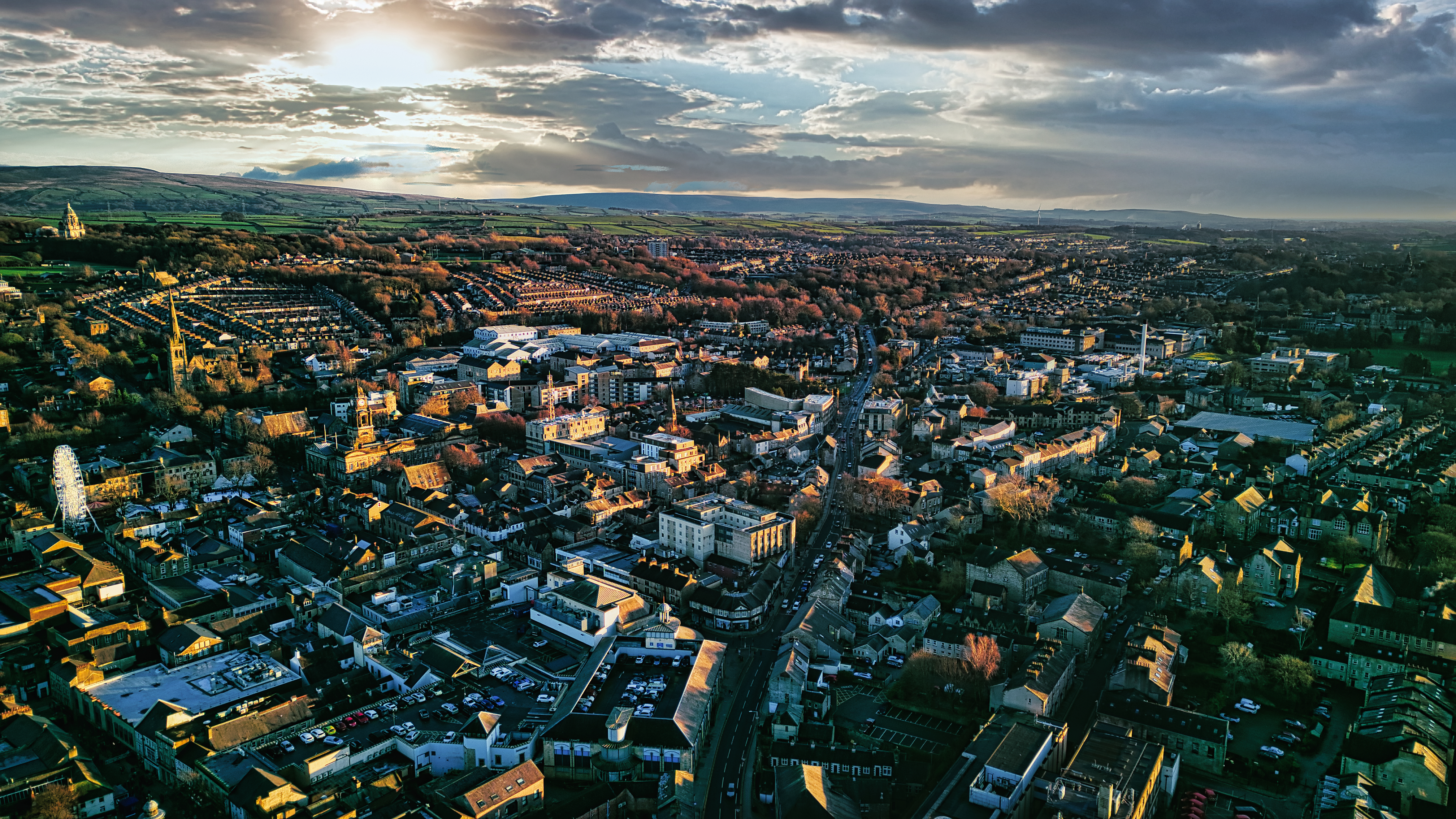 Aerial view of the Lancaster city at sunset with warm light casting over buildings and streets, showcasing urban landscape and architecture.