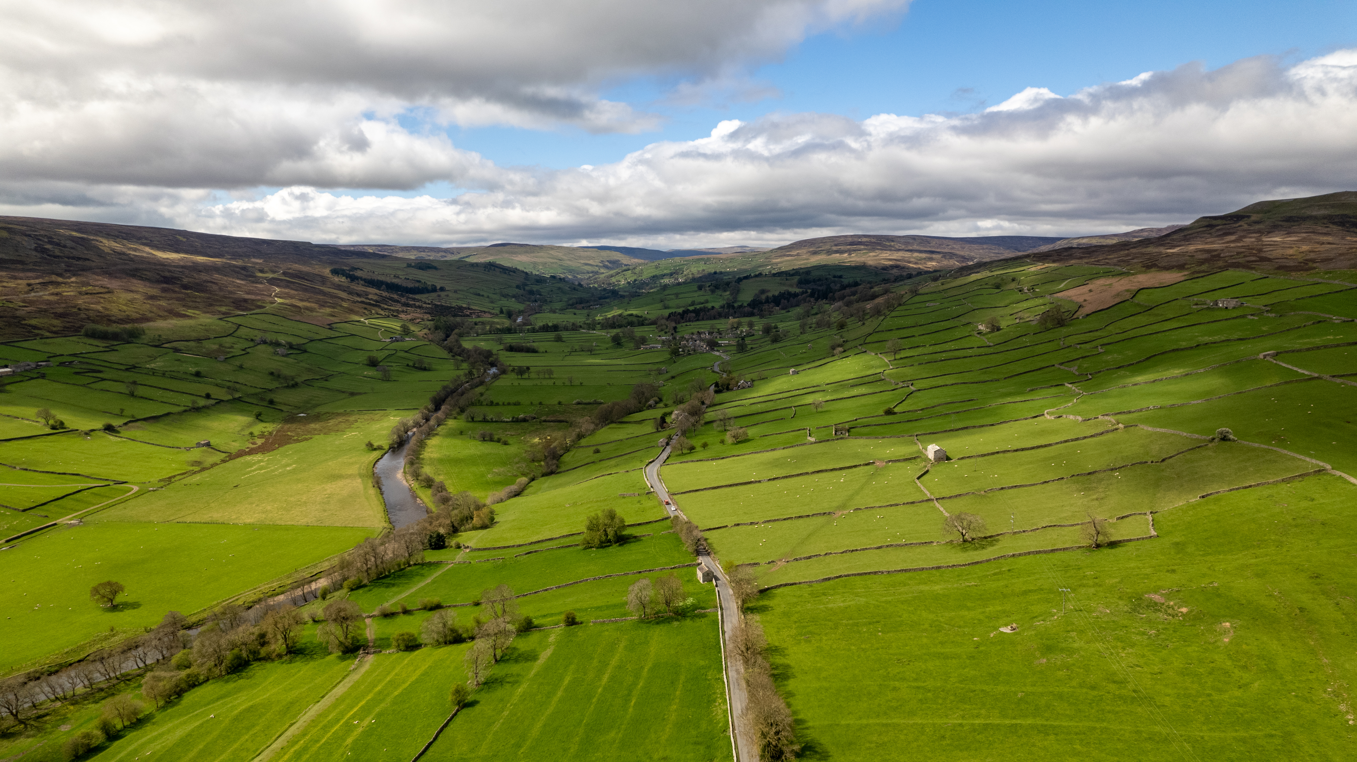 Aerial view of the countryside road and hills in Yorkshire