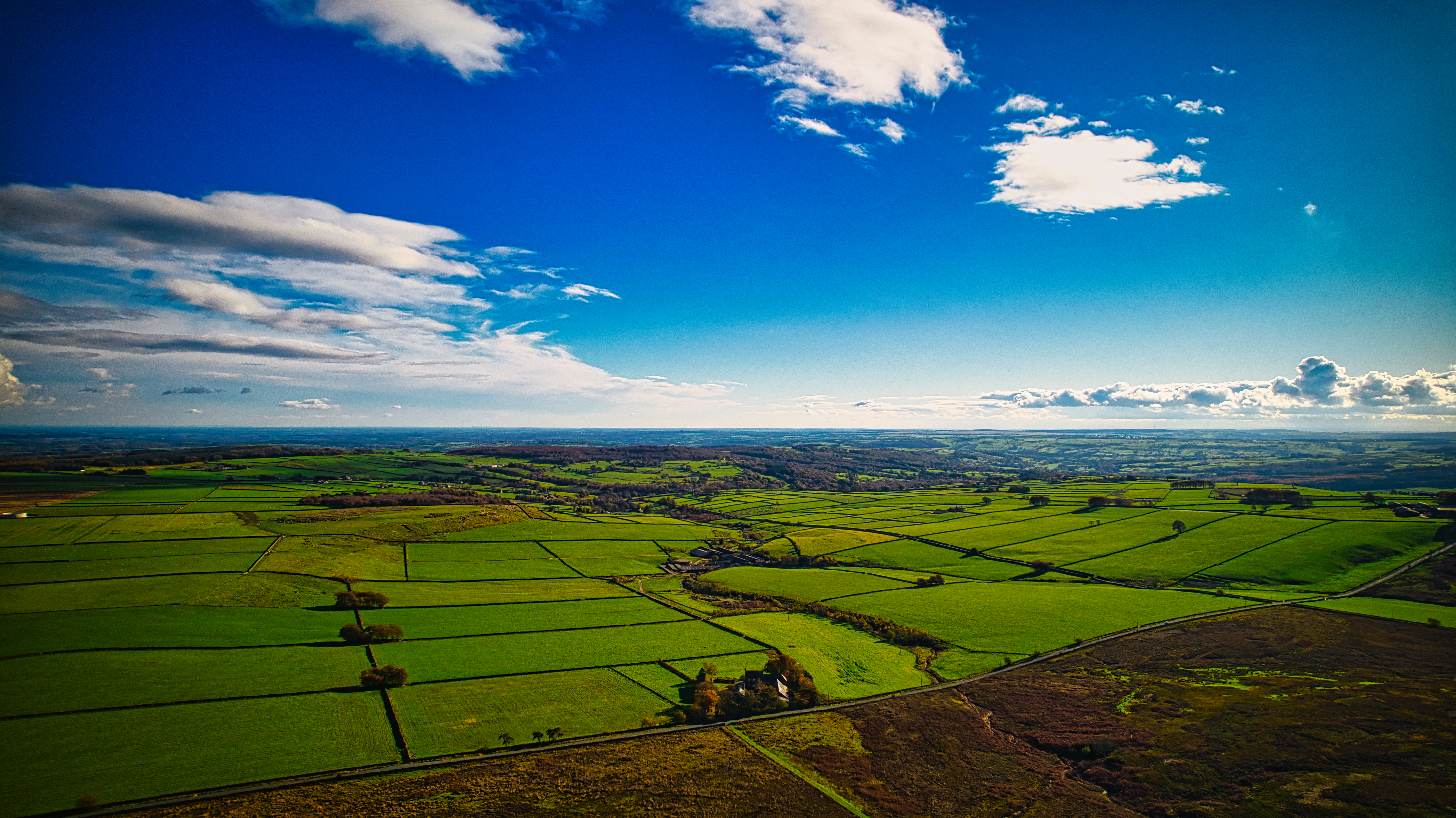 Aerial view of the farm land in Yorkshire Dales during the summer