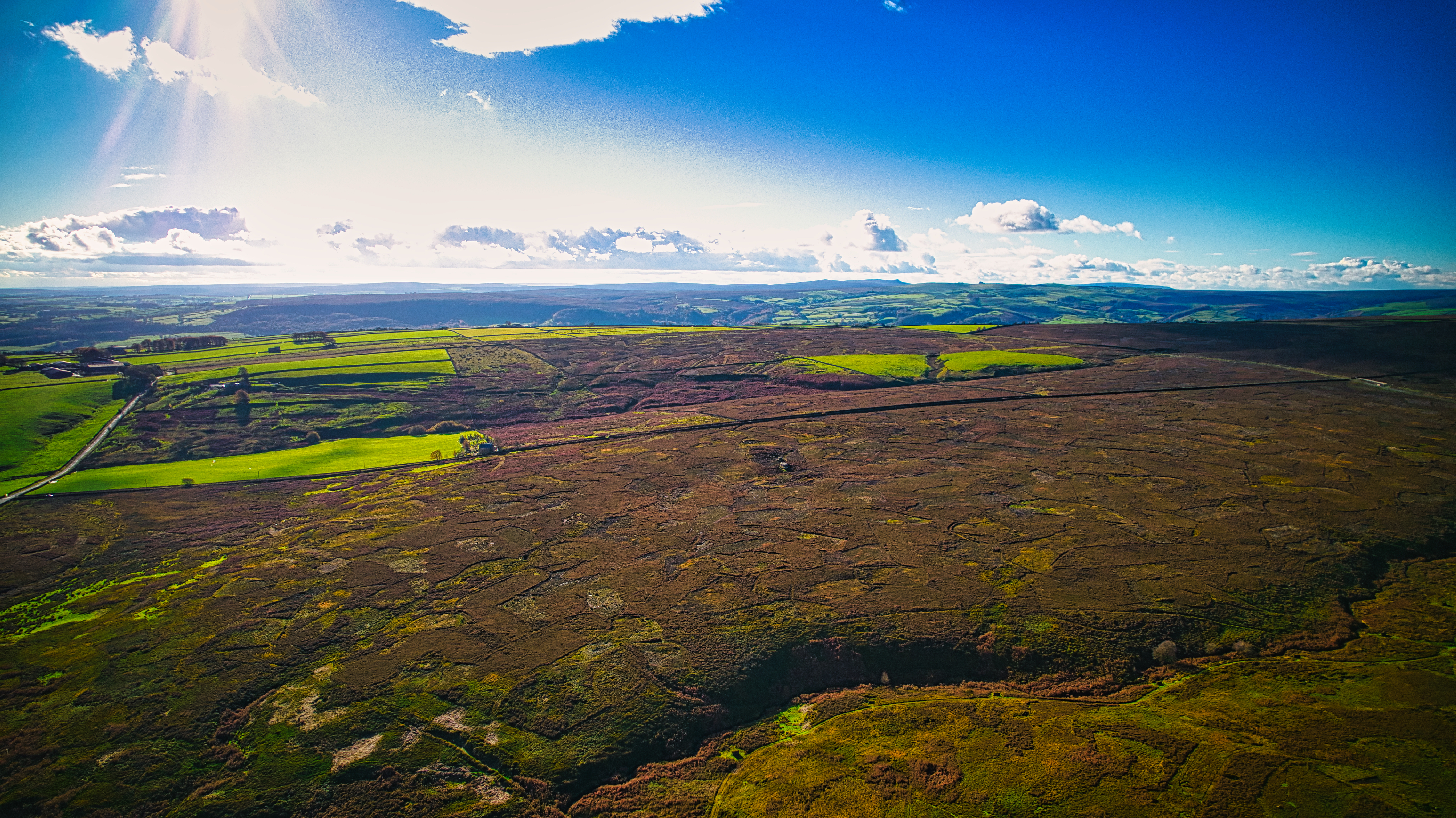 Aerial view of the farmland and clouds above in Yorkshire