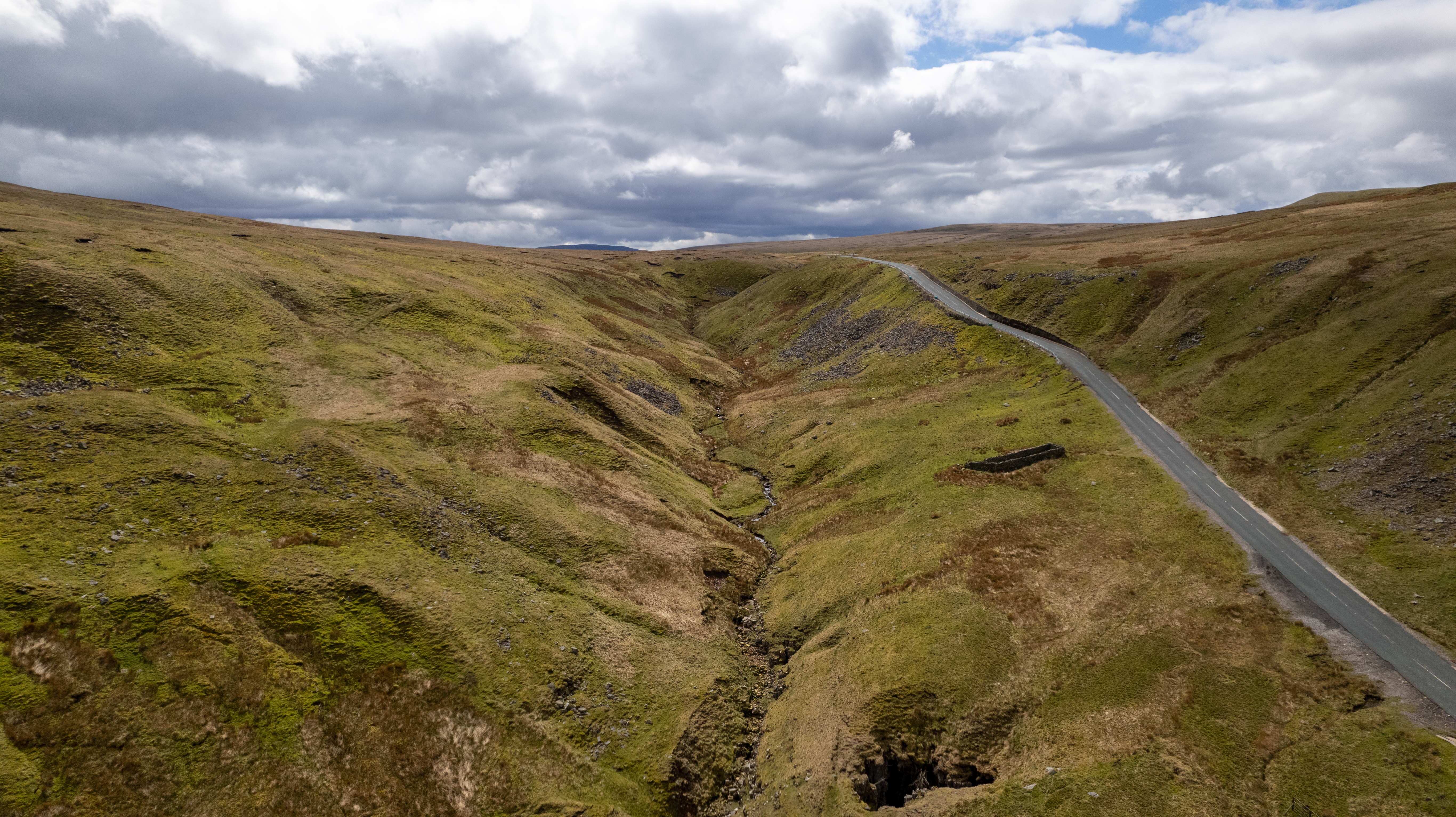 Aerial view of the road in the mountains during the cloudy day