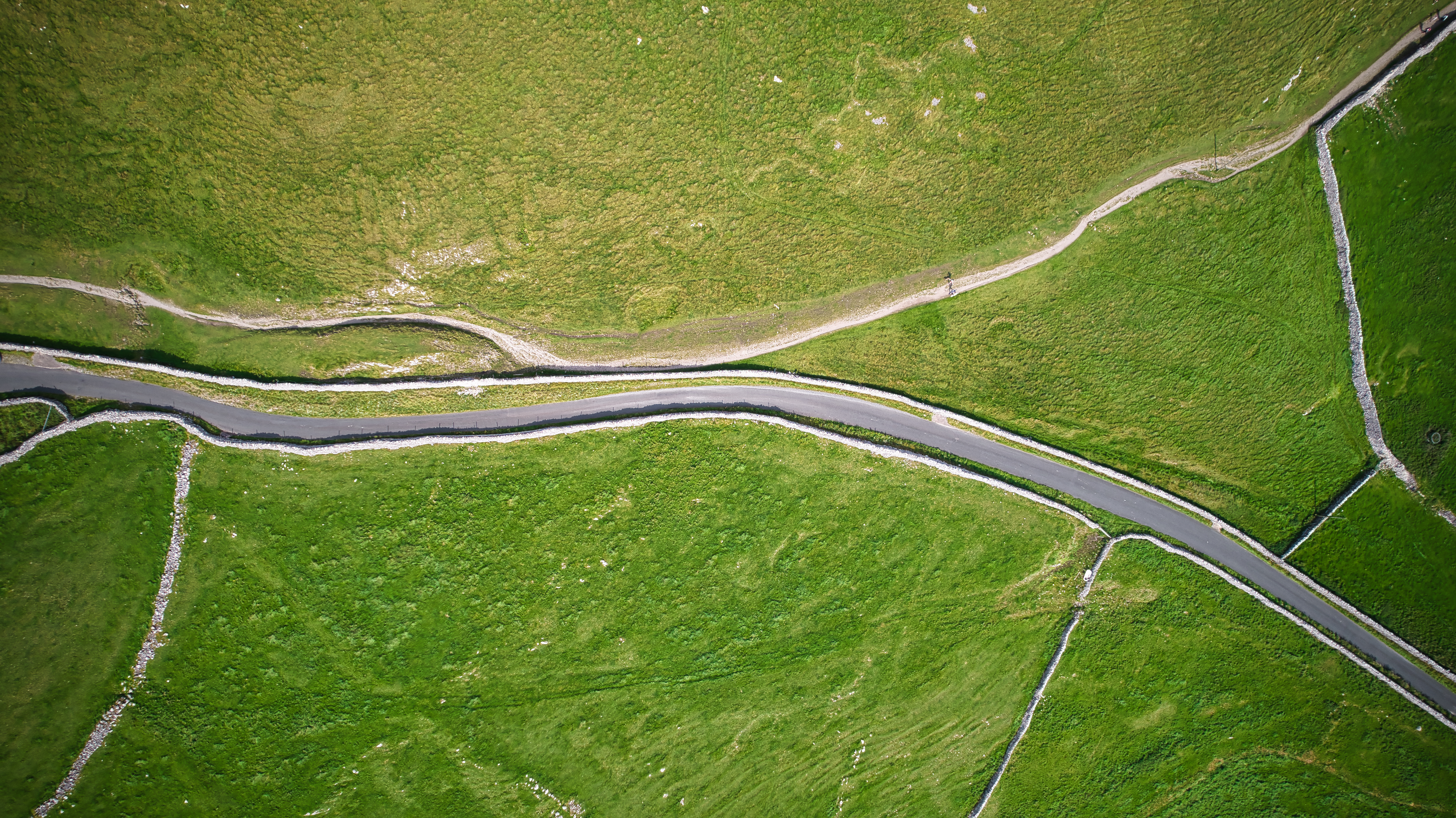 Aerial view of winding roads cutting through lush green hills.