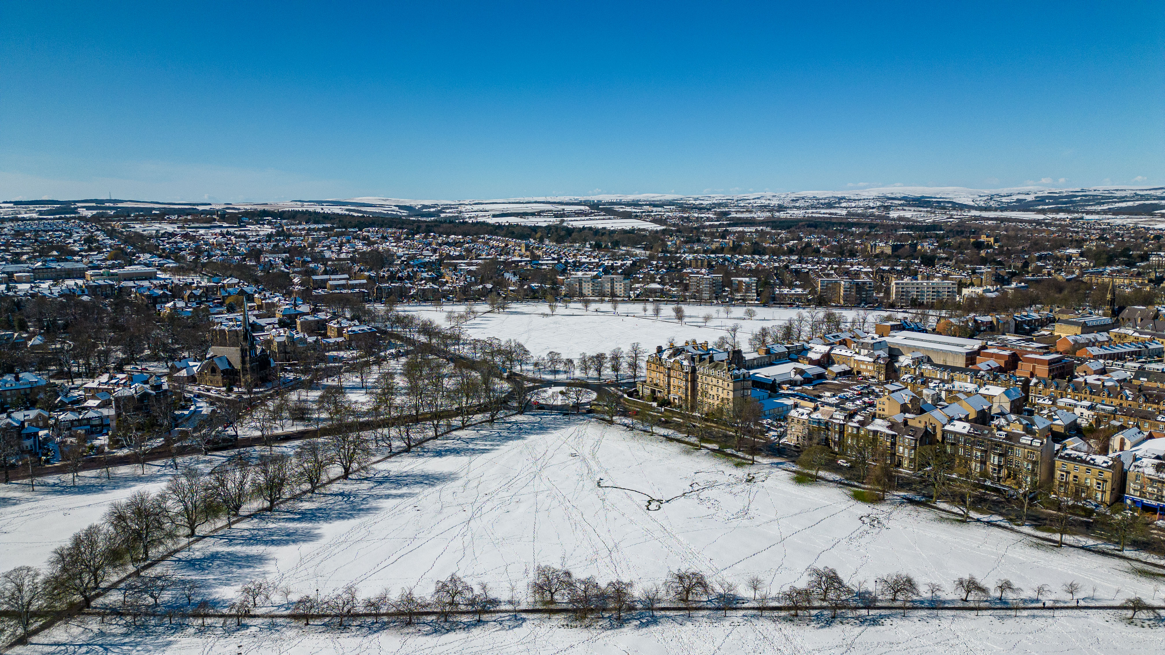 Aerial winter view of a snow-covered town with buildings and bare trees, under a clear blue sky in Harrogate, North Yorkshire.