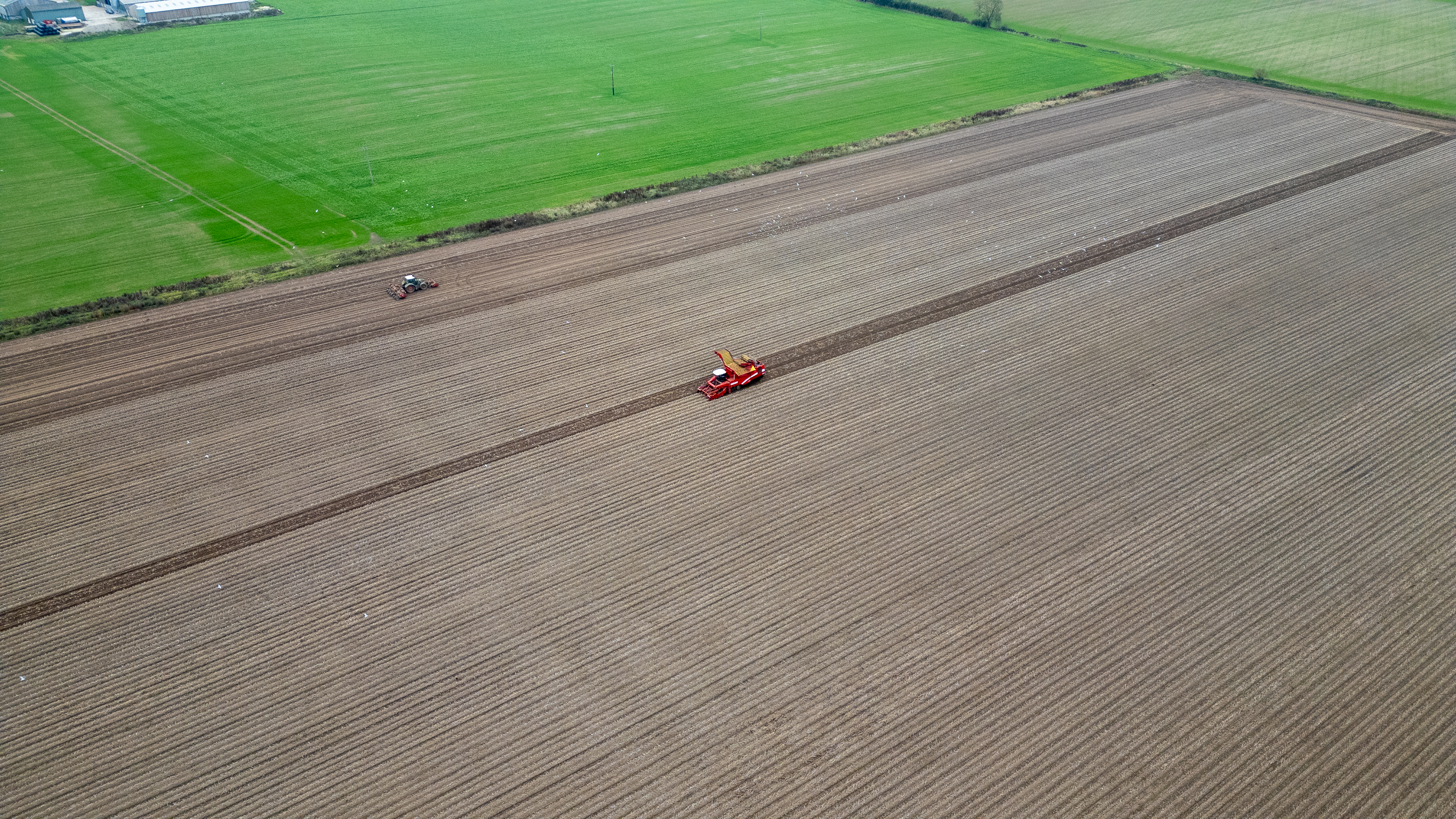An aerial view of a farmed landscape featuring a bright green field adjacent to a large, brown, plowed field with two tractors working.