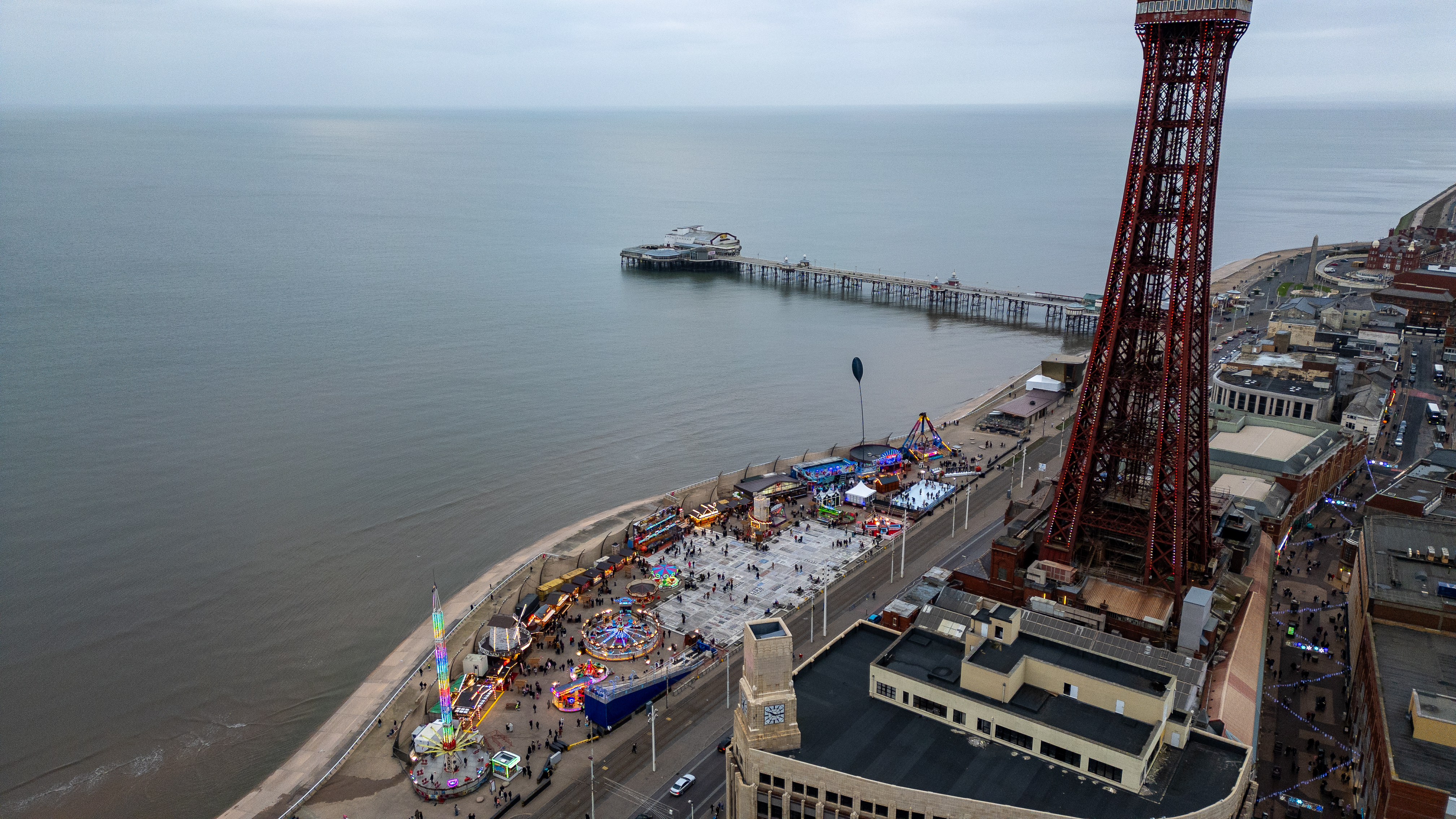 Aerial view of a seaside amusement park and pier, with a tall red tower dominating the foreground and a gray sky overhead in Blackpool.
