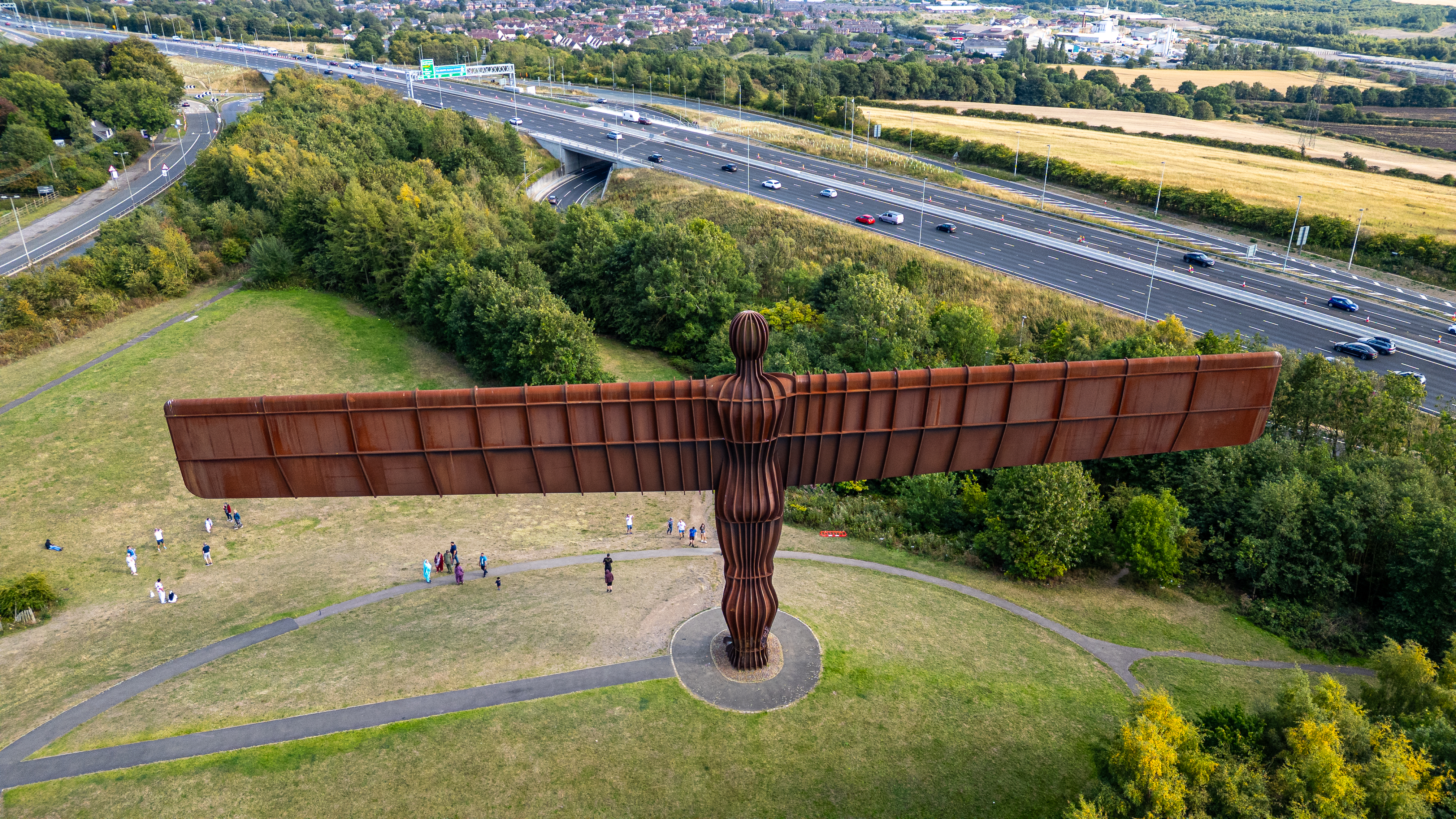 An aerial view of the Angel of the North sculpture, a large, rust-colored steel structure with outstretched wings, set against a green landscape and a busy highway in Newcastle upon Tyne, UK.