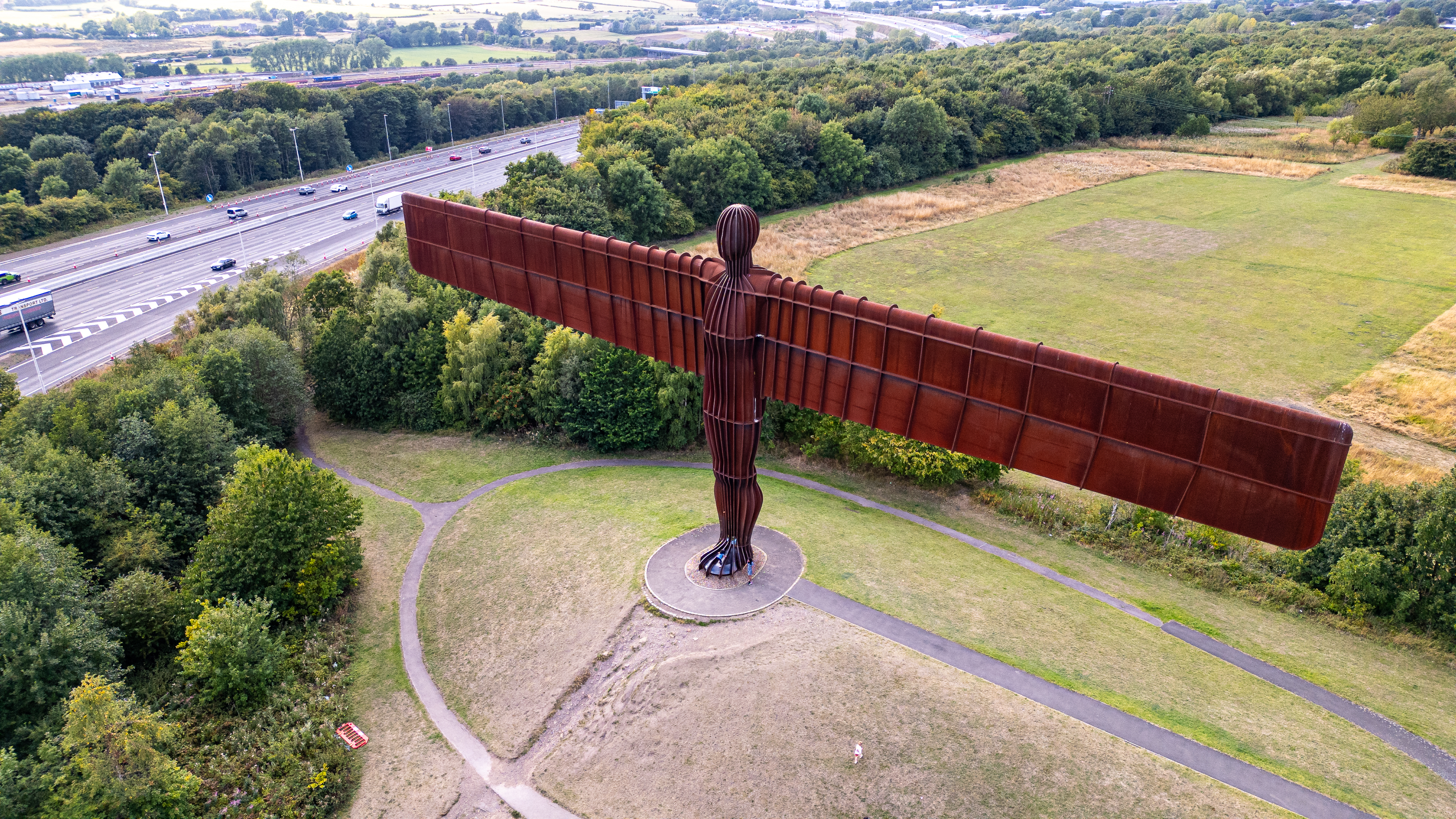 An imposing rusty metal sculpture of a human figure with outstretched wings stands on a grassy mound, with a highway and lush green trees in the background in Newcastle upon Tyne, UK.