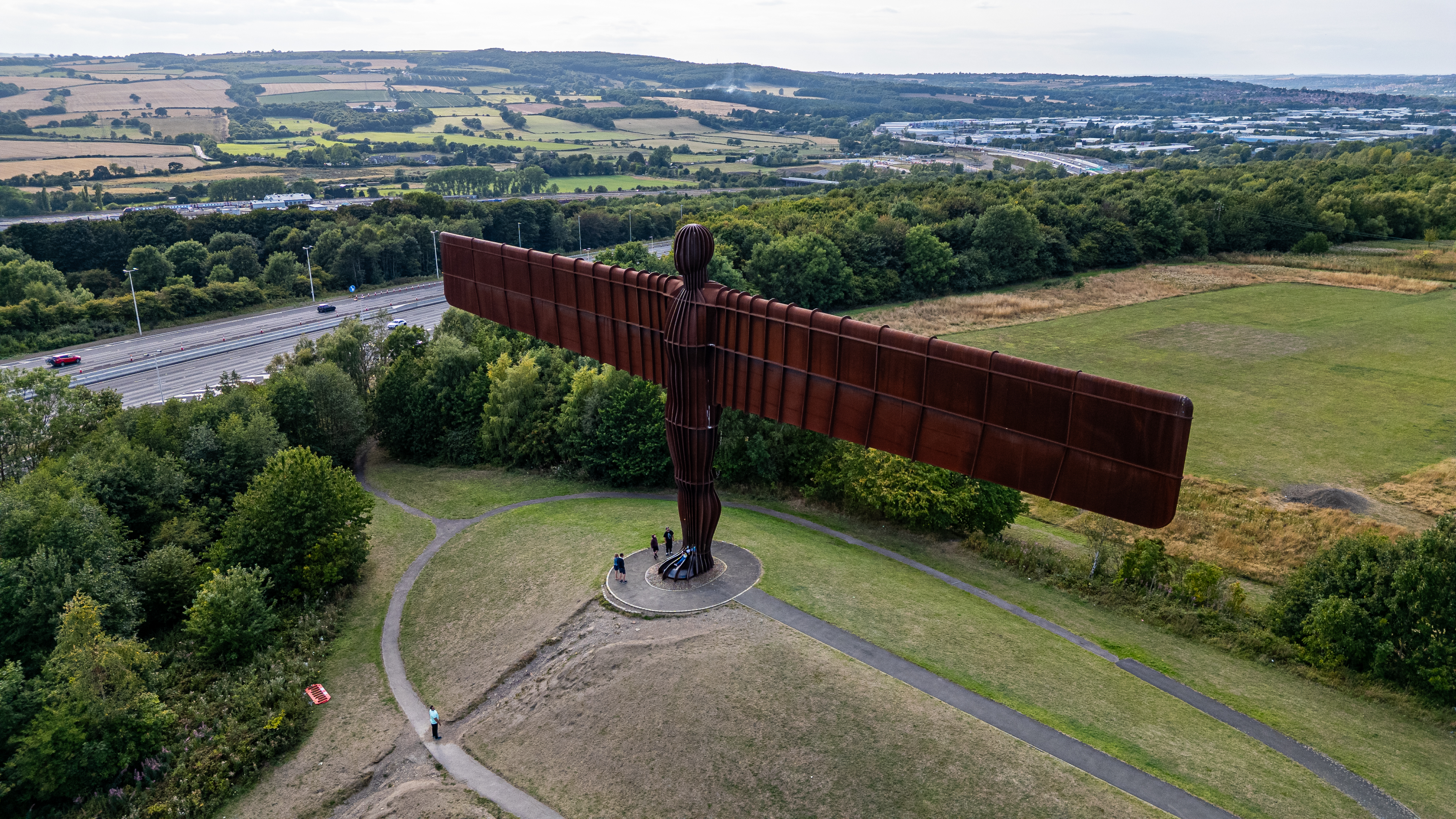 A large, rust-colored metal sculpture of an angel with outstretched wings stands on a grassy hill. A highway and distant landscape are visible behind it in Newcastle upon Tyne, UK.