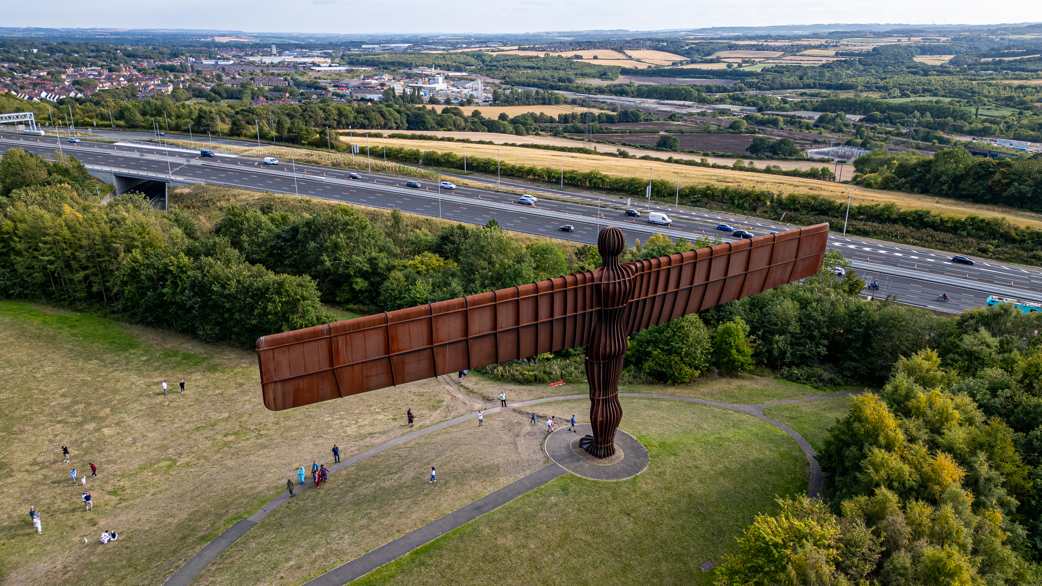 An aerial view captures the Angel of the North sculpture, a colossal rusted metal figure with outstretched wings, situated in a grassy field. A multi-lane highway with traffic stretches across the background, bordered by trees and a distant cityscape under a hazy sky in Newcastle upon Tyne, UK.