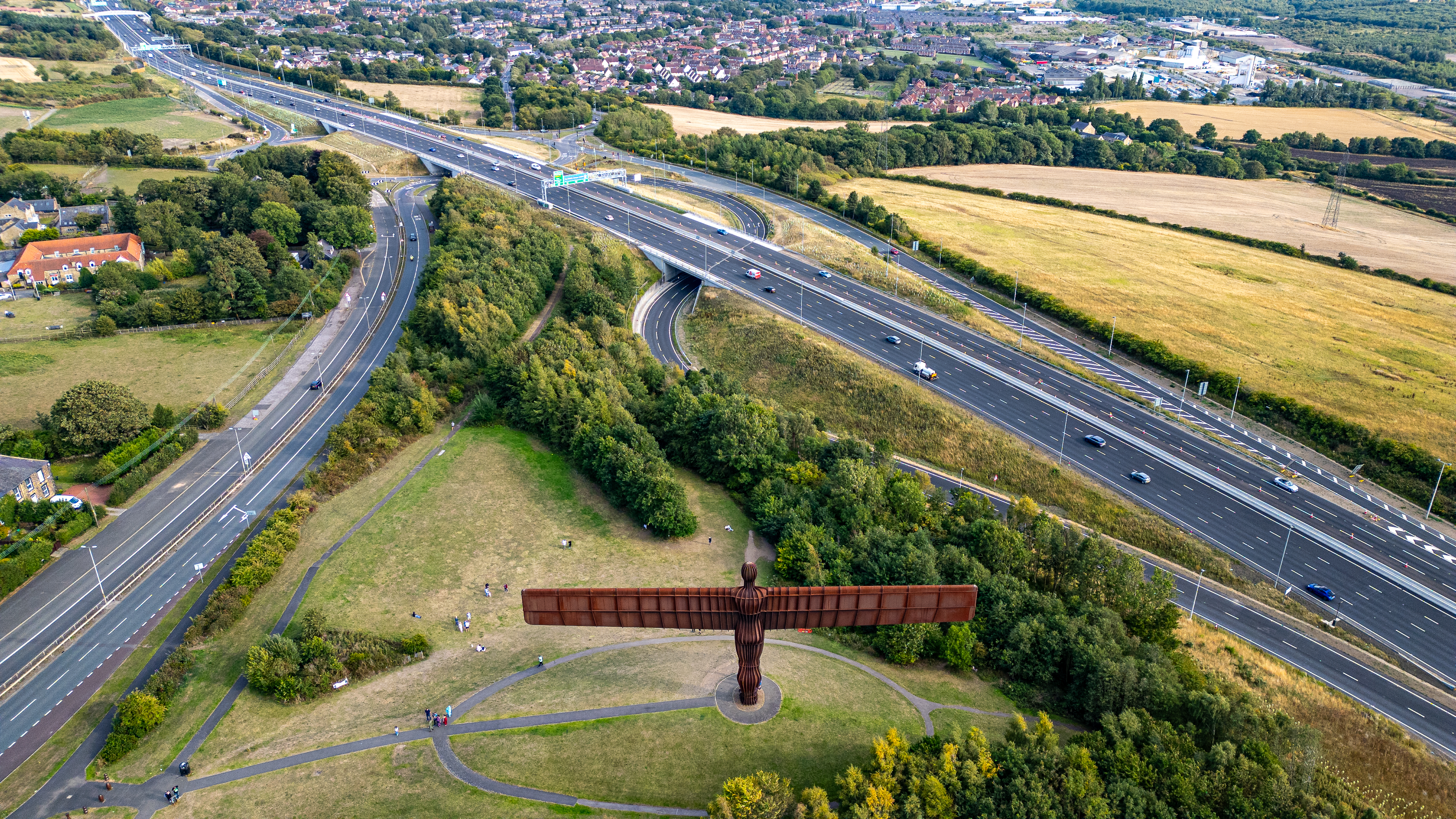 Aerial view of the Angel of the North sculpture with a highway and surrounding landscape, featuring a cluster of buildings in the background in Newcastle upon Tyne, UK.