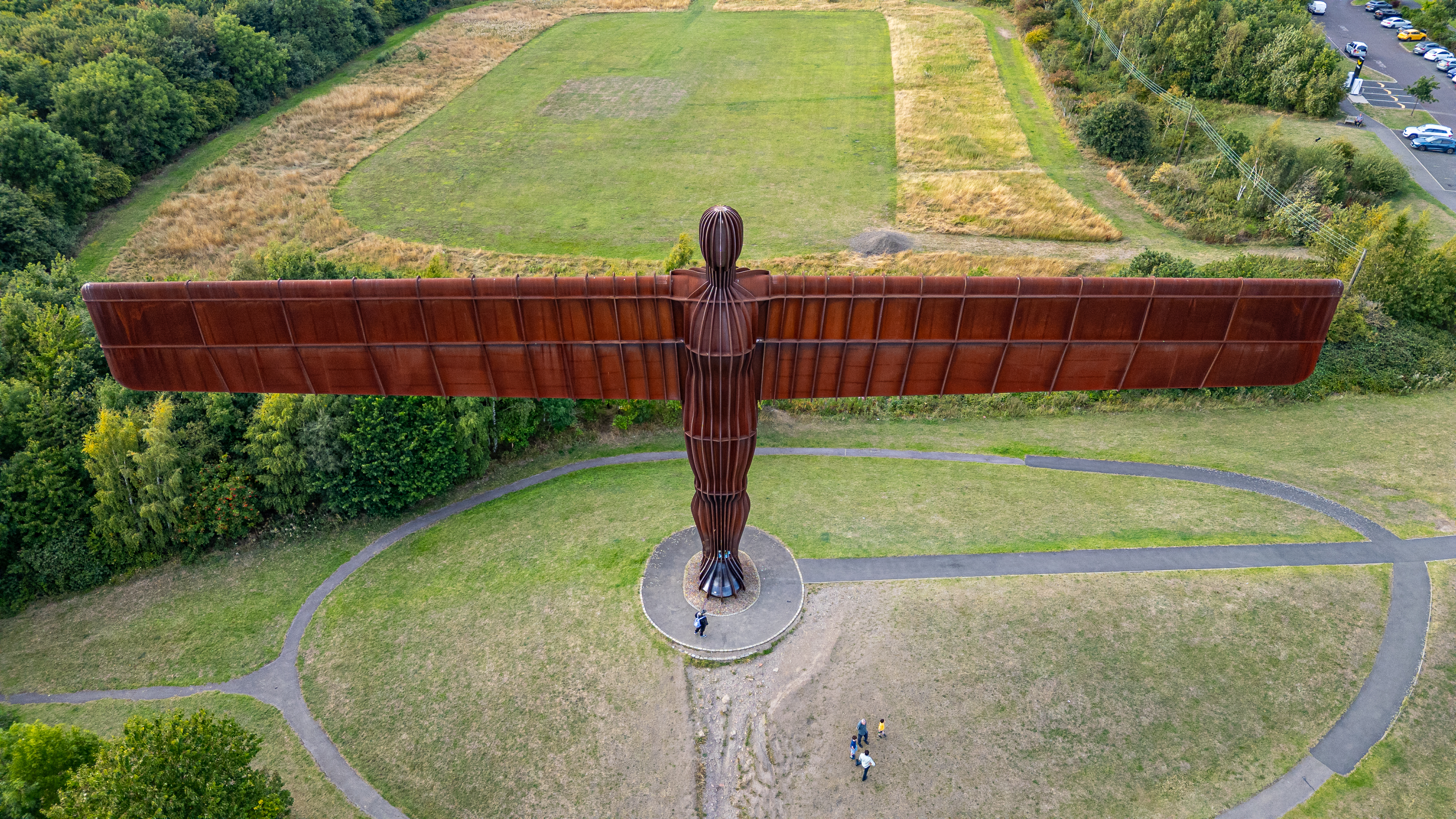 An aerial view of a large, rusty metal sculpture with outstretched wings, set against a backdrop of green fields and trees in Newcastle upon Tyne, UK.