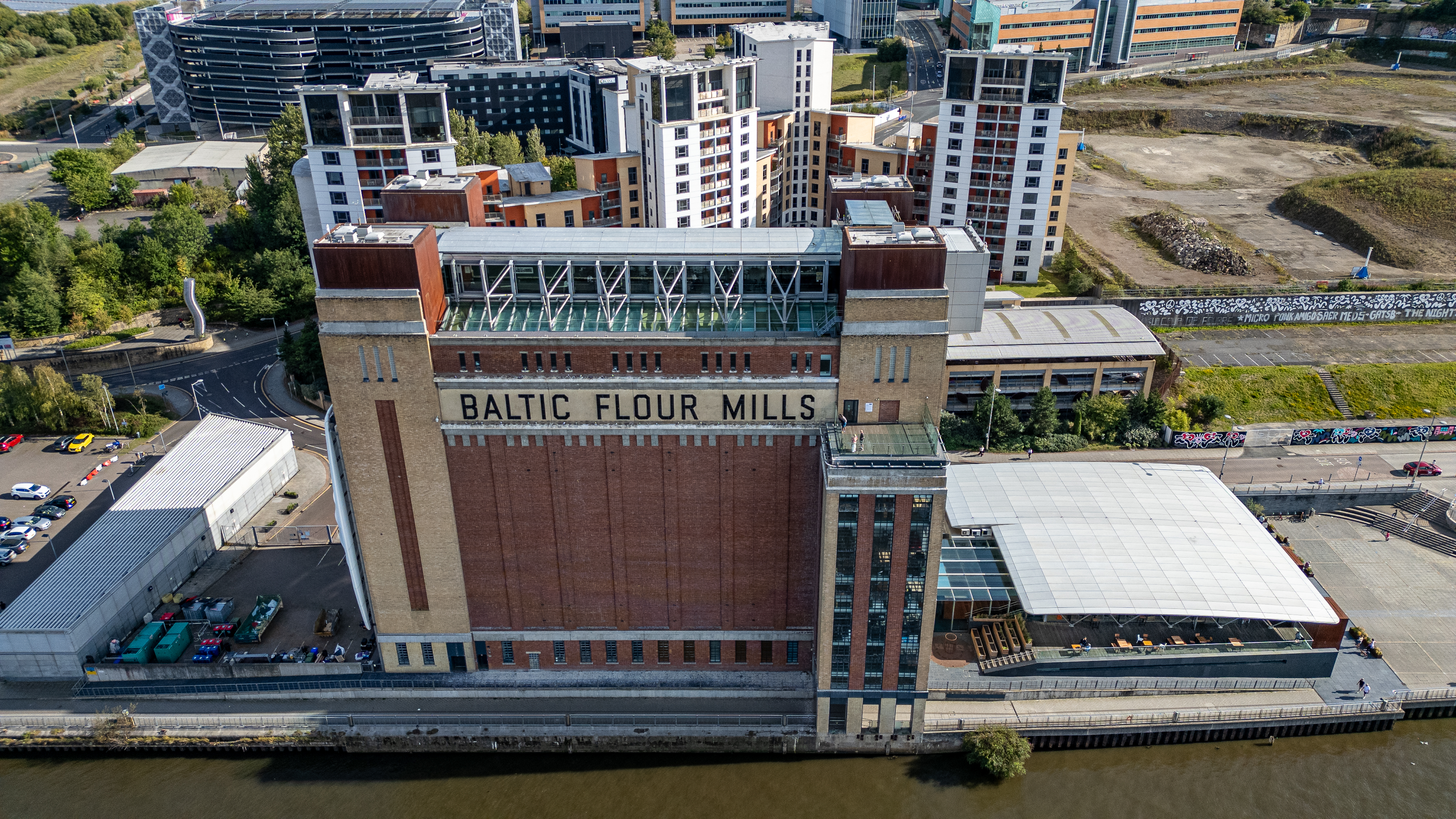 Aerial view of the Baltic Flour Mills building and surrounding urban waterfront, featuring brick architecture, modern structures, and a body of water in Newcastle upon Tyne, UK.