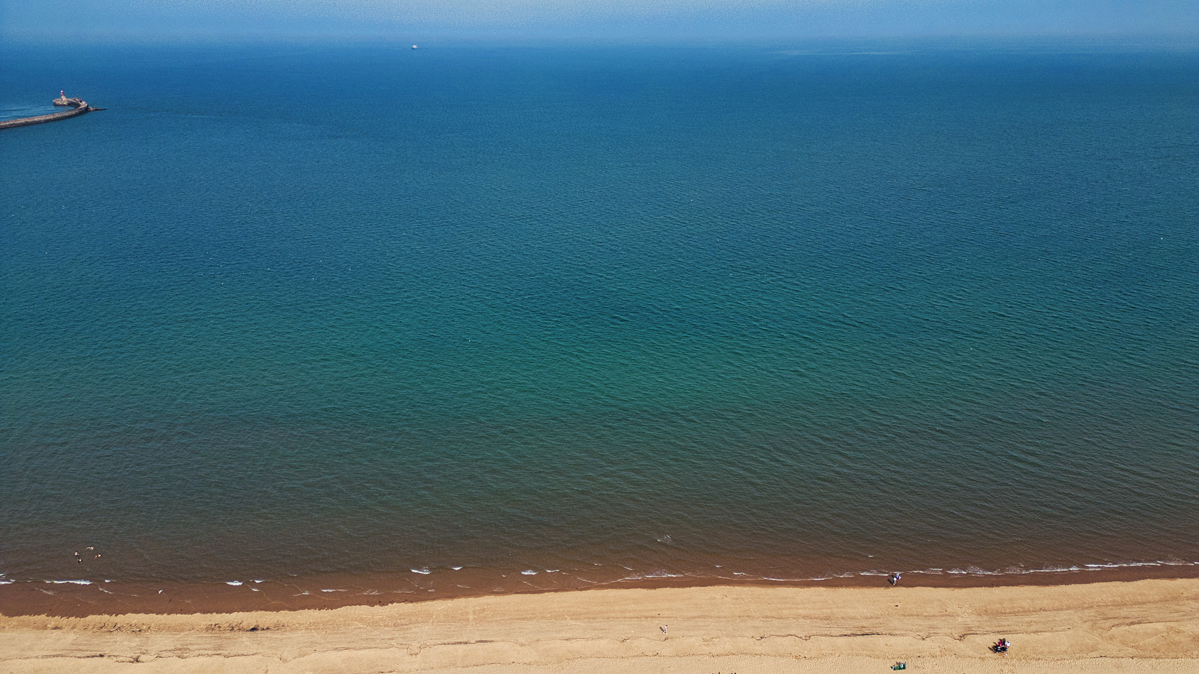 Aerial view of a sandy beach, ocean, and a distant pier. The water transitions from deep blue to turquoise near the shore at Sandhaven Beach, UK.