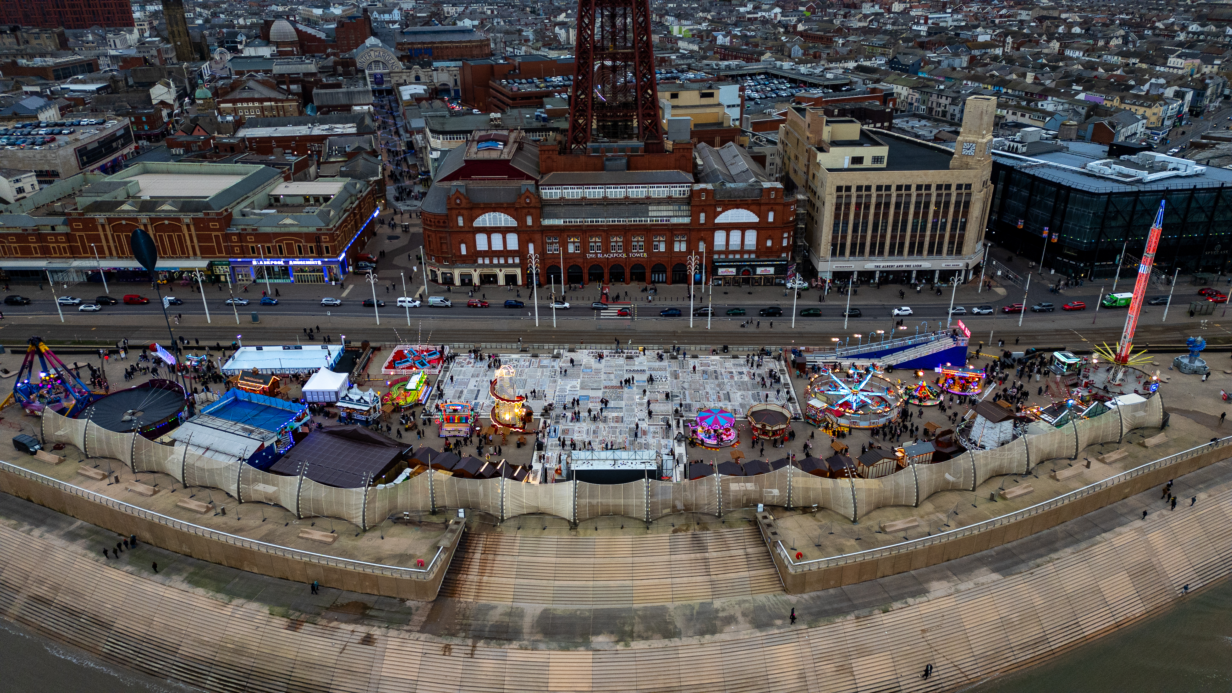 Aerial view of an amusement park and beach promenade with the Blackpool Tower in the background.