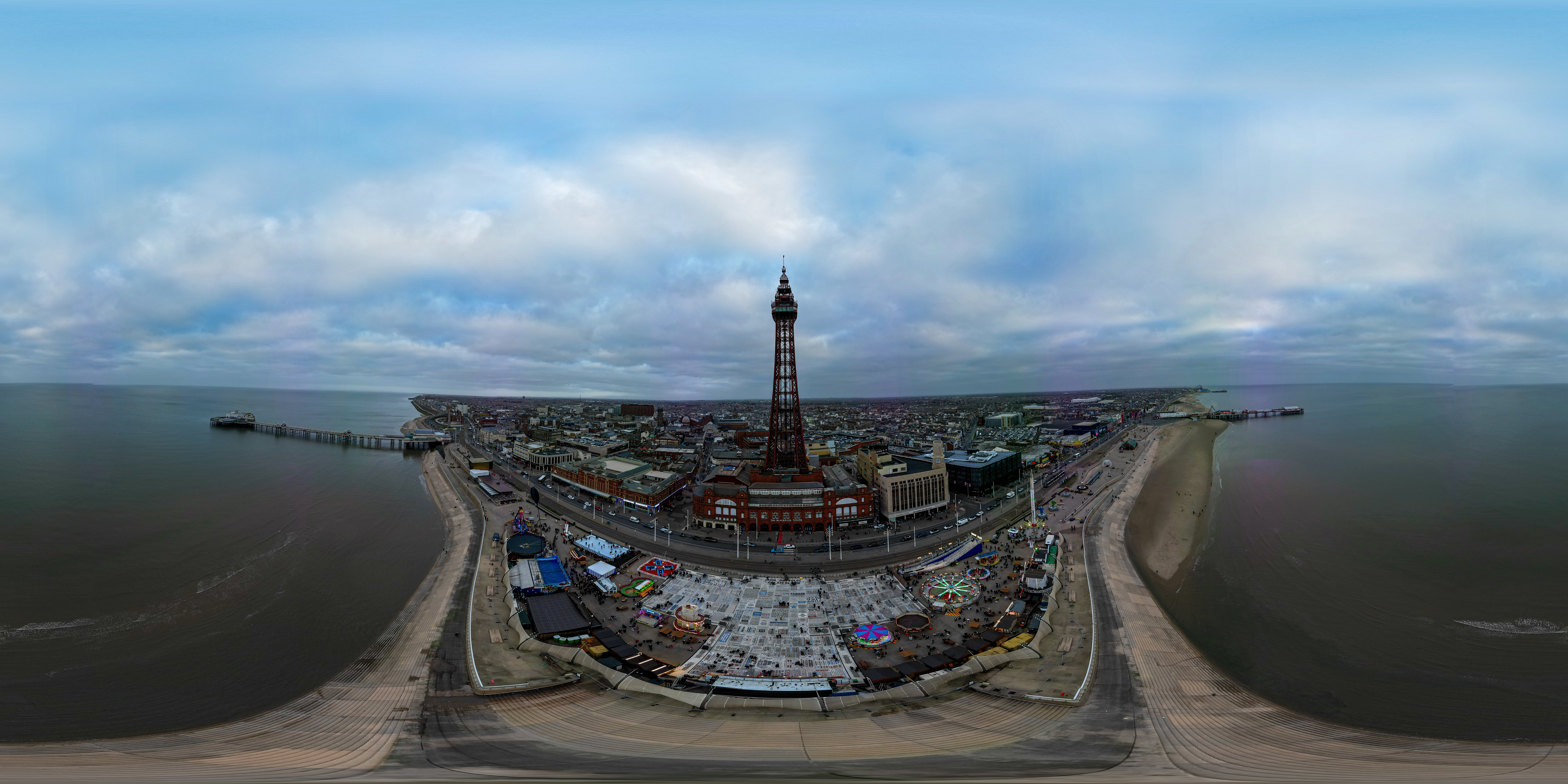 360-degree panoramic view of Blackpool Tower and Pleasure Beach, with piers, amusement rides, beach, and the sea under a cloudy sky.