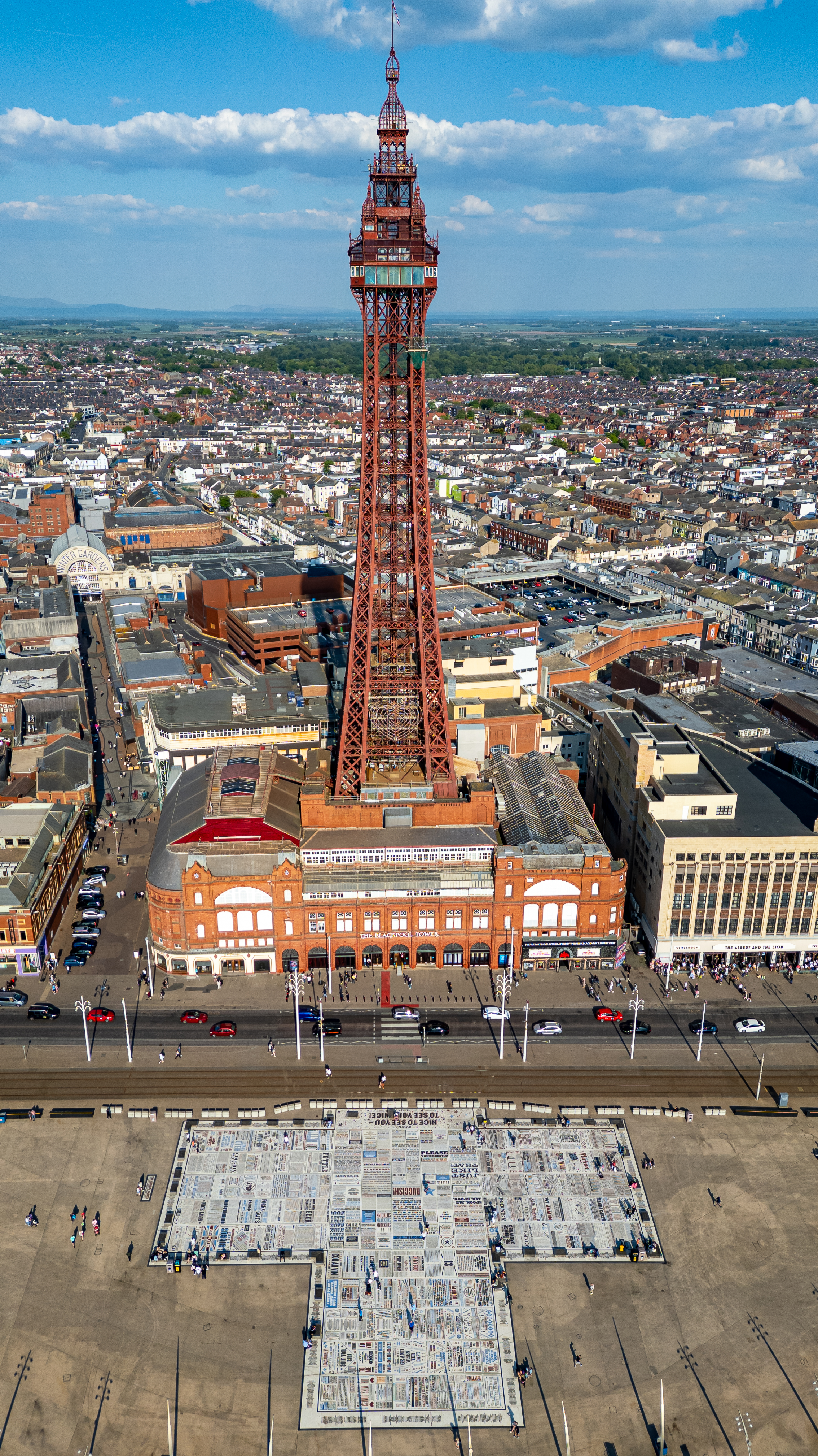 An aerial view captures the iconic red lattice tower of Blackpool Tower overlooking a cityscape with a patterned pavement installation in the foreground and blue sky with clouds above.