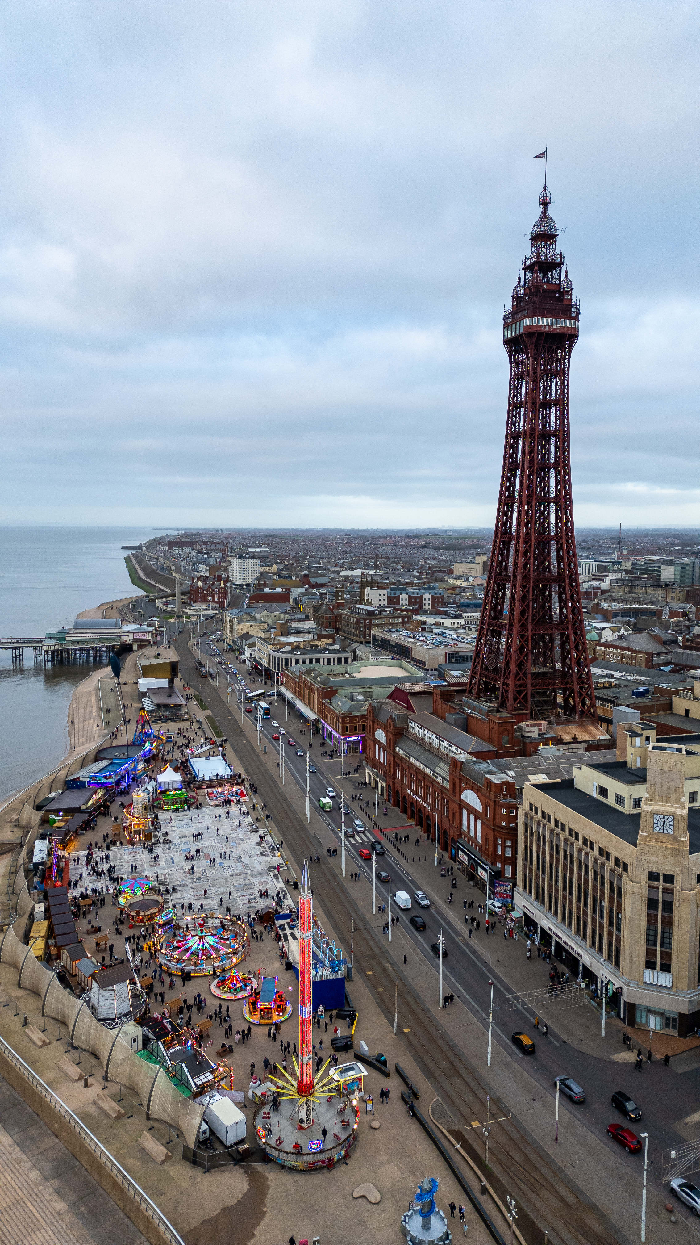 An aerial view of a coastal city with a prominent iron tower, a bustling amusement area, and a seaside promenade under a cloudy sky.