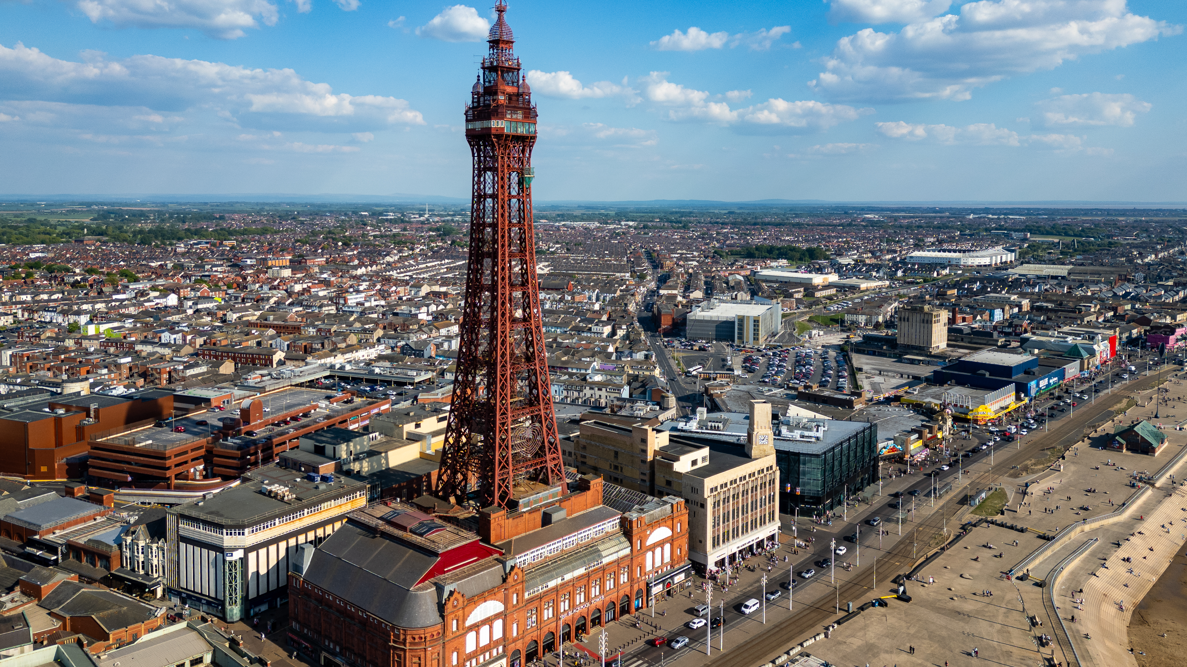 An aerial view captures a tall, red iron tower dominating a coastal city with a beach and a bustling promenade filled with people and vehicles.