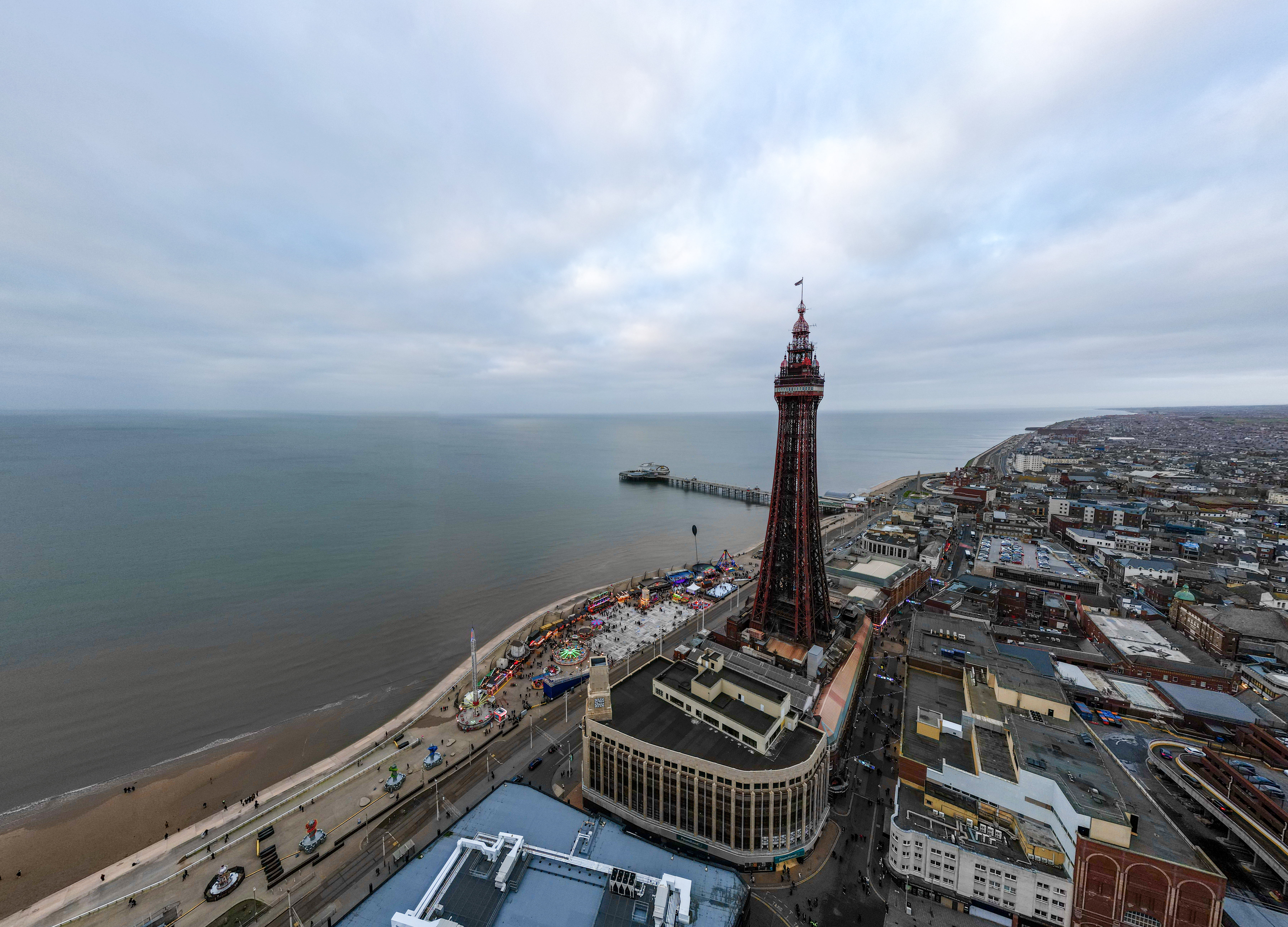 Aerial view of Blackpool Tower and promenade, with the sea on the left and a cityscape on the right under a cloudy sky.