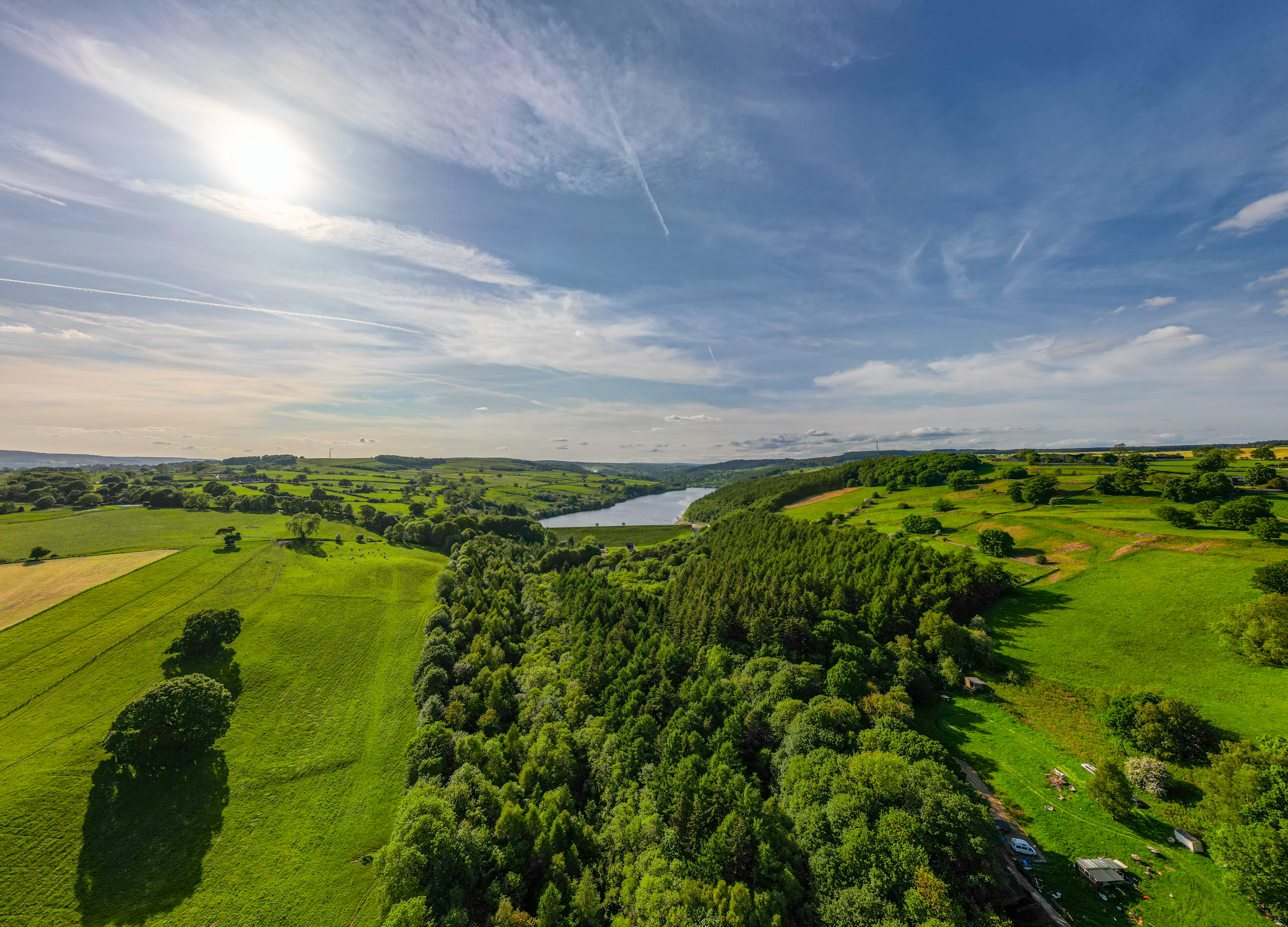 Breathtaking aerial view of a lush green countryside with a river, under a majestic blue sky with sunbeams.