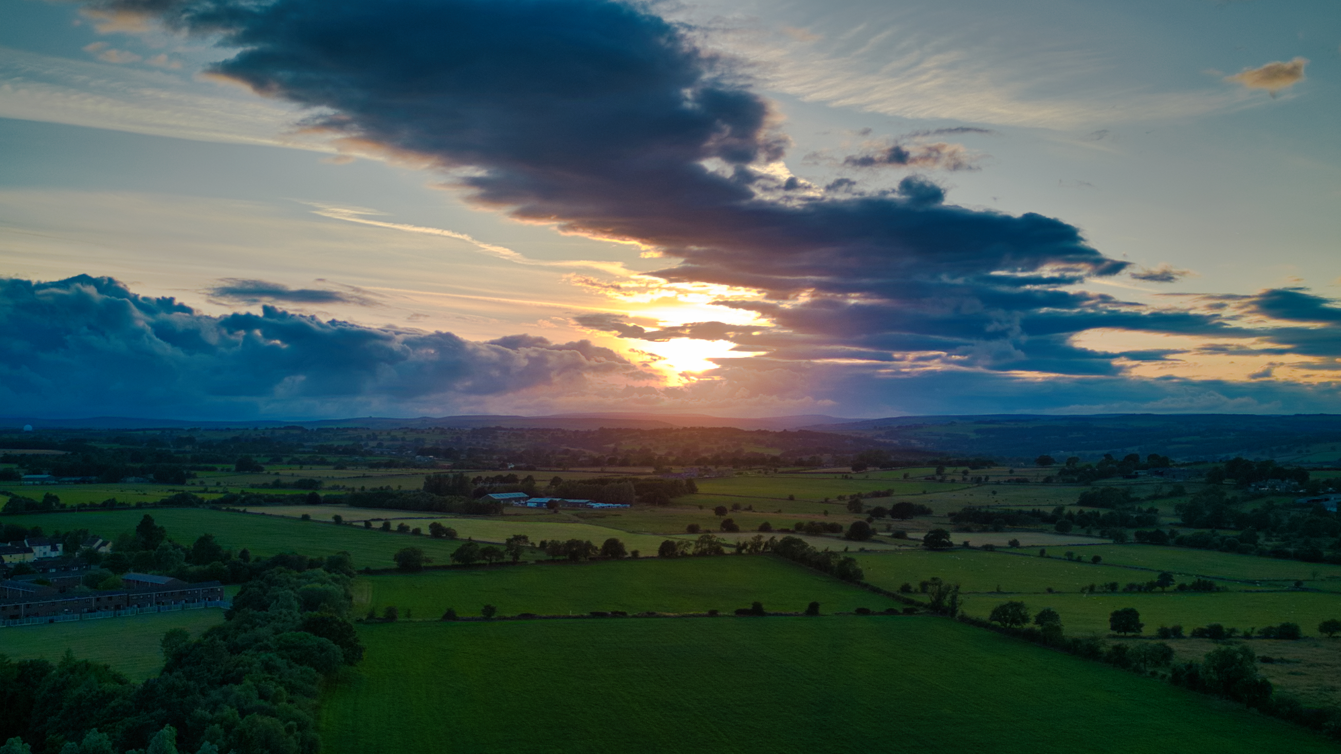 Breathtaking aerial view of a sunset over lush green fields with dramatic clouds in the sky in Harrogate, North Yorkshire.