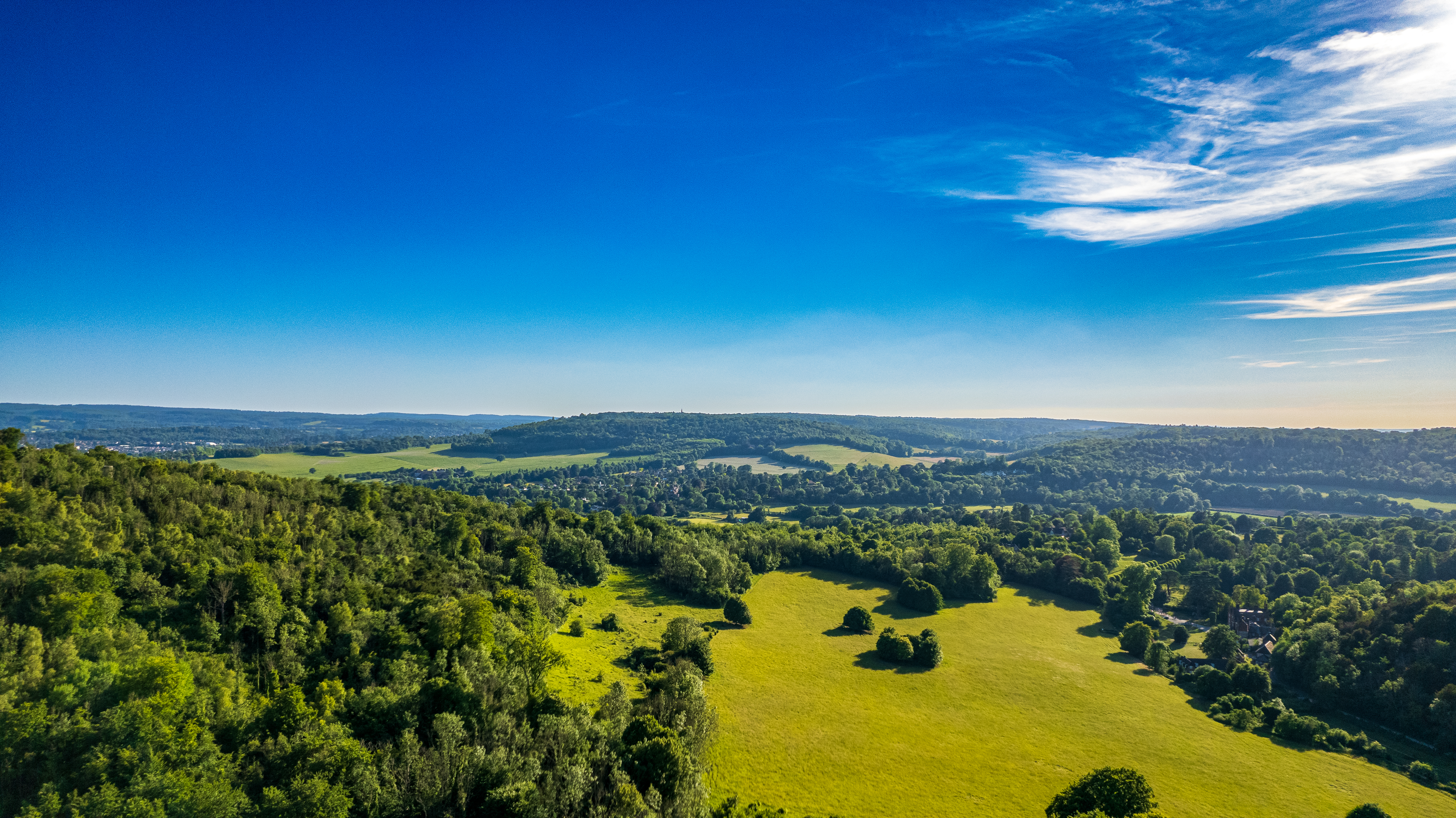 Breathtaking aerial view of lush green countryside under a clear blue sky.