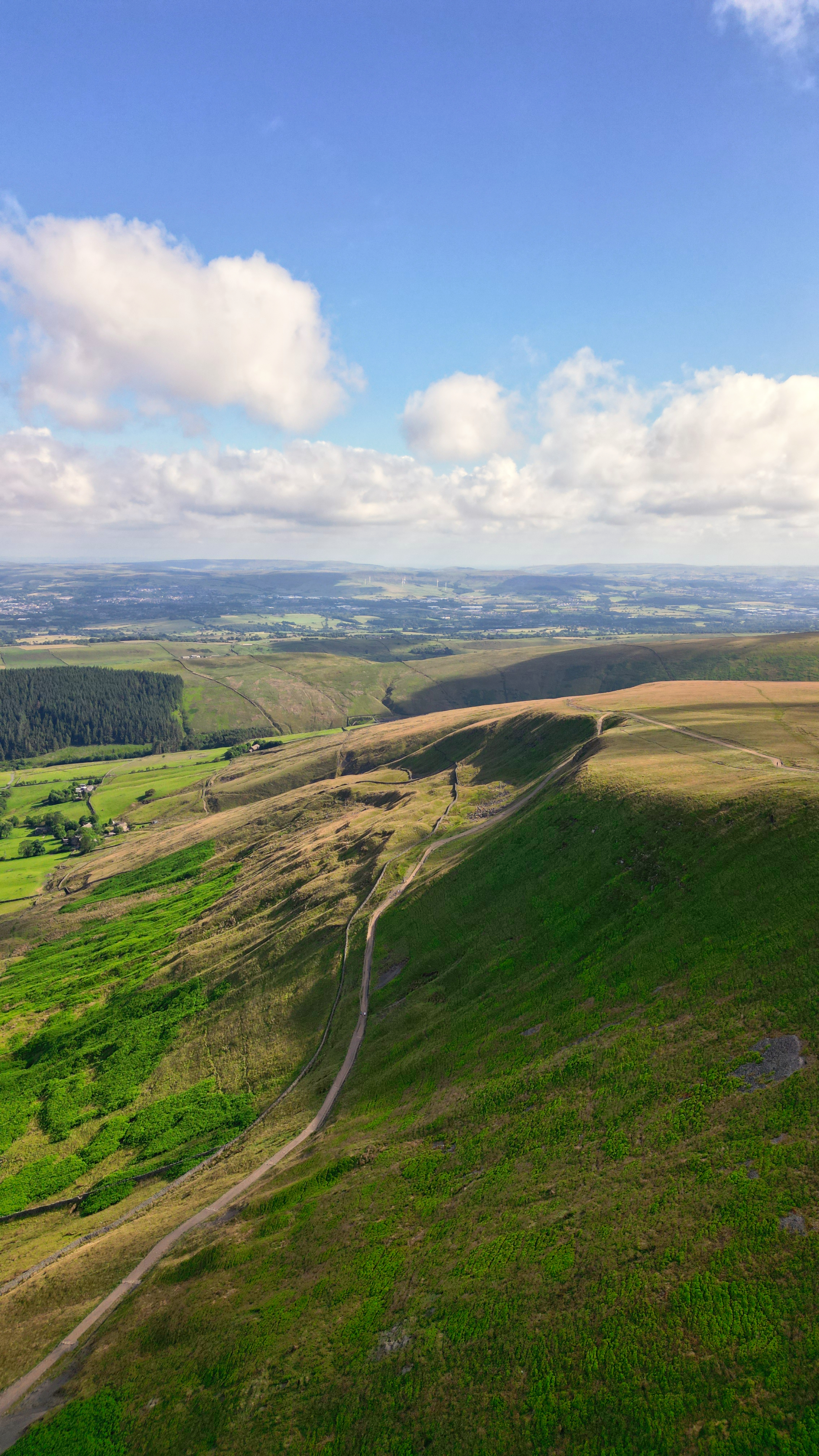 Breathtaking aerial view of lush green countryside with rolling hills and a clear blue sky in Pendle Hill, England.