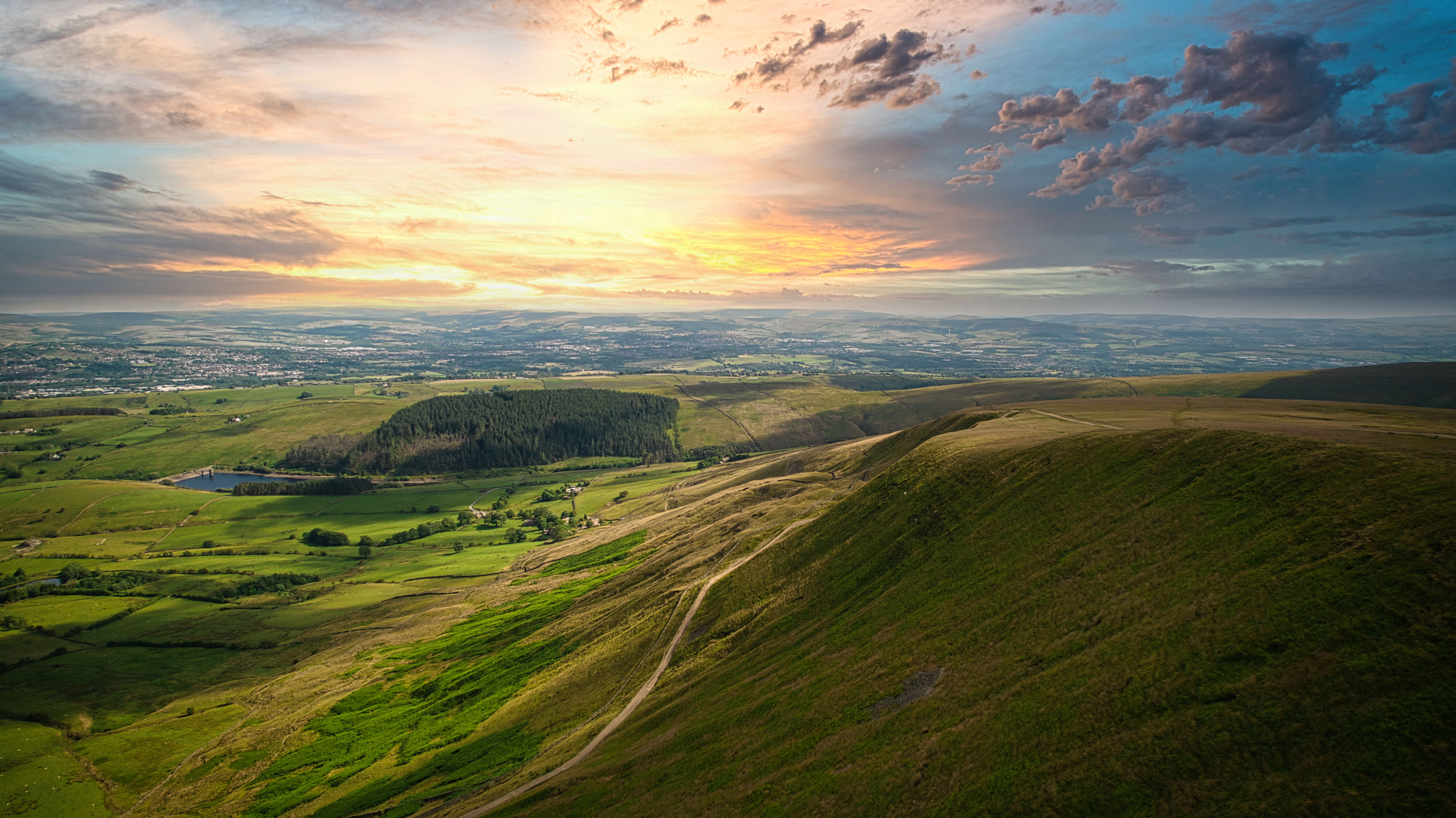 Breathtaking aerial view of rolling hills with a vibrant sunrise over a lush countryside landscape in Pendle Hill, England.