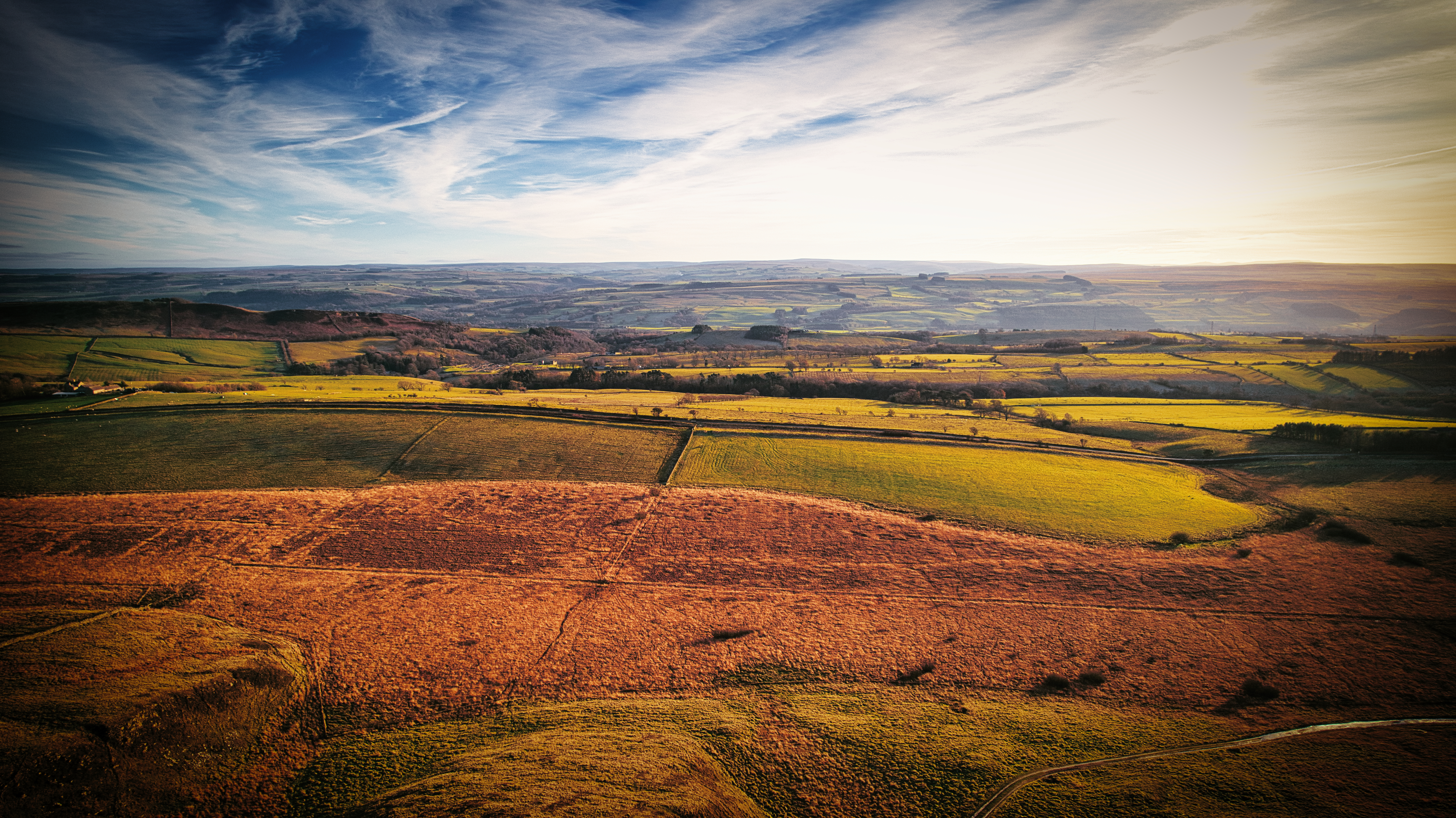 Breathtaking panoramic view of a rolling countryside with vibrant fields under a dynamic sky at Sycamore Gap, Northumberland, UK.