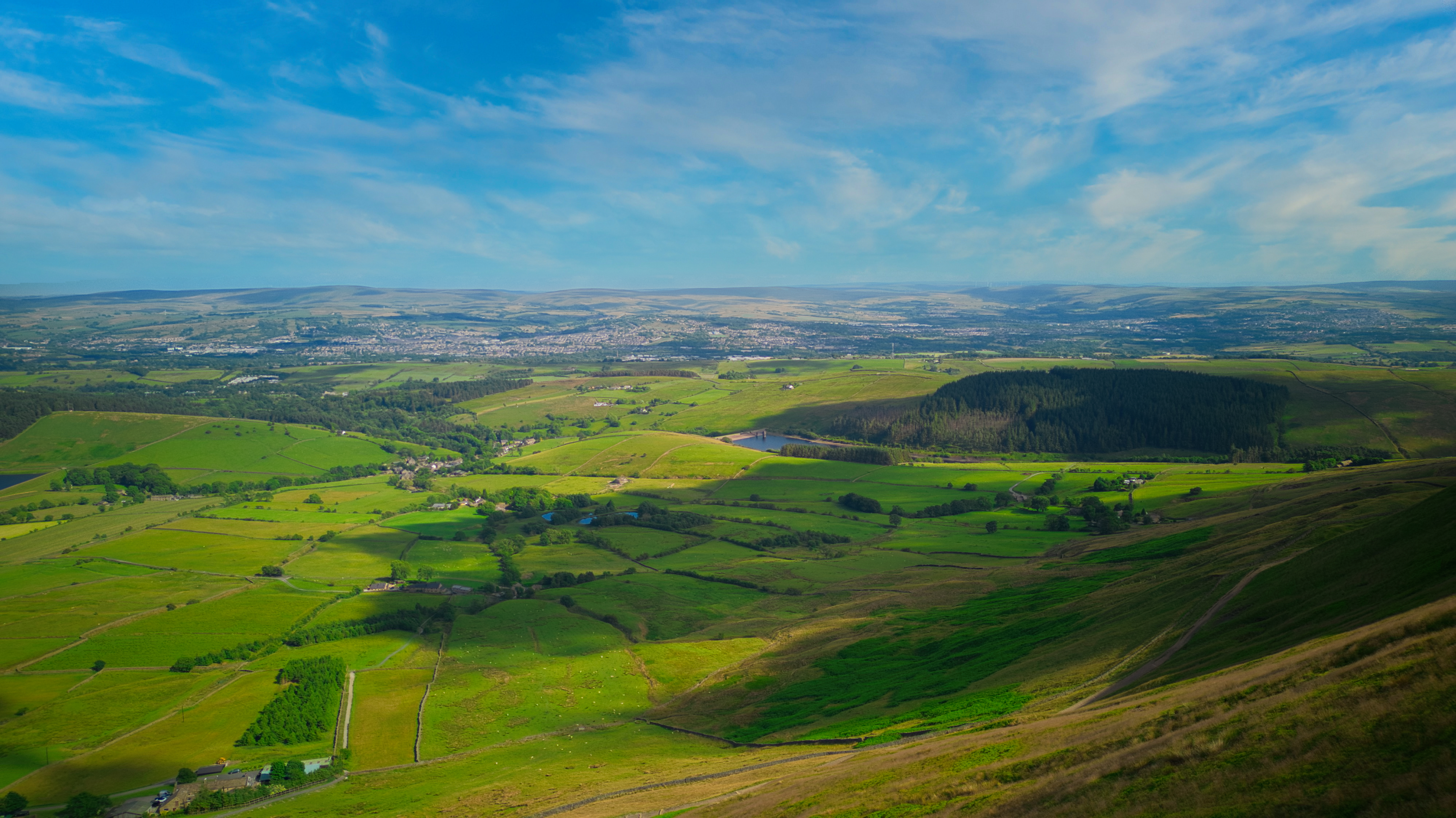 Breathtaking panoramic view of lush green countryside with rolling hills under a clear blue sky in Pendle Hill, England.