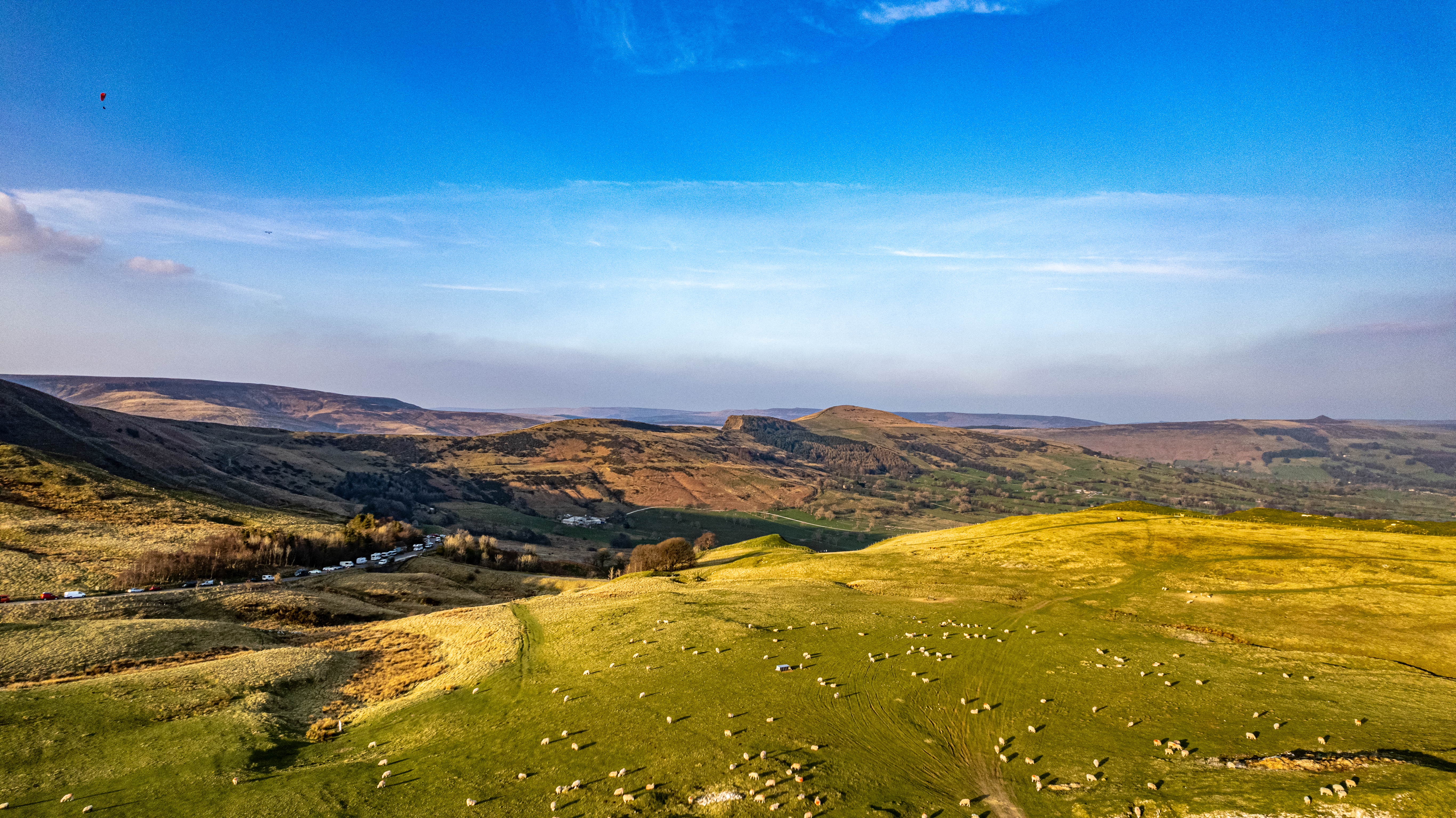 Breathtaking panoramic view of rolling hills and open skies, ideal for landscape and travel themes in Peak District, England.