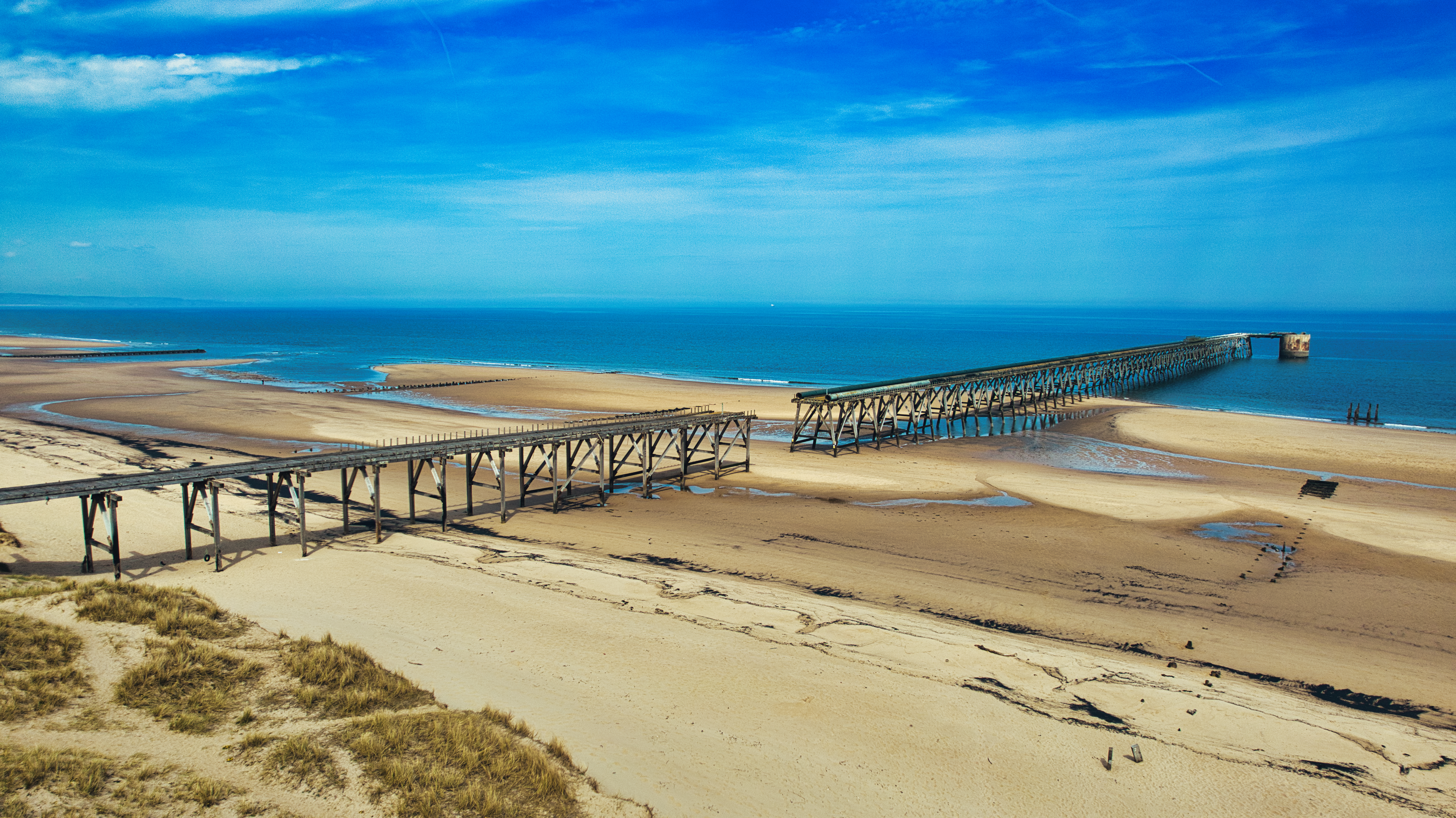 Aerial view of a sandy beach with two sections of a long, dilapidated pier extending into the ocean under a blue sky at Steetley Pier, UK.