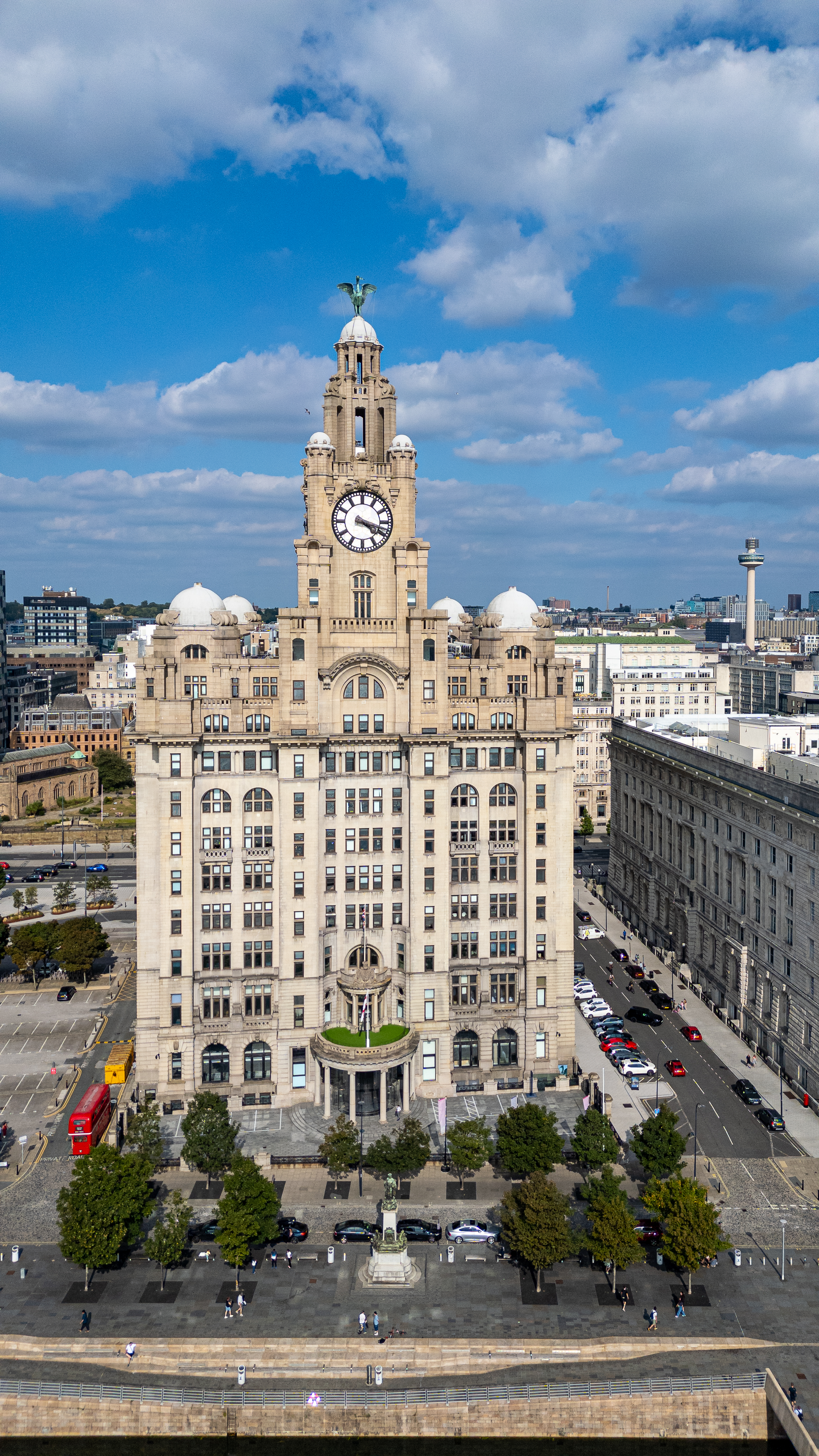 An aerial view of a grand, light-colored stone building with a prominent clock tower topped by a statue. The building features arched windows, domes, and classical architectural details. Surrounding it are city streets with cars, trees, and a body of water in the foreground in Liverpool, UK.