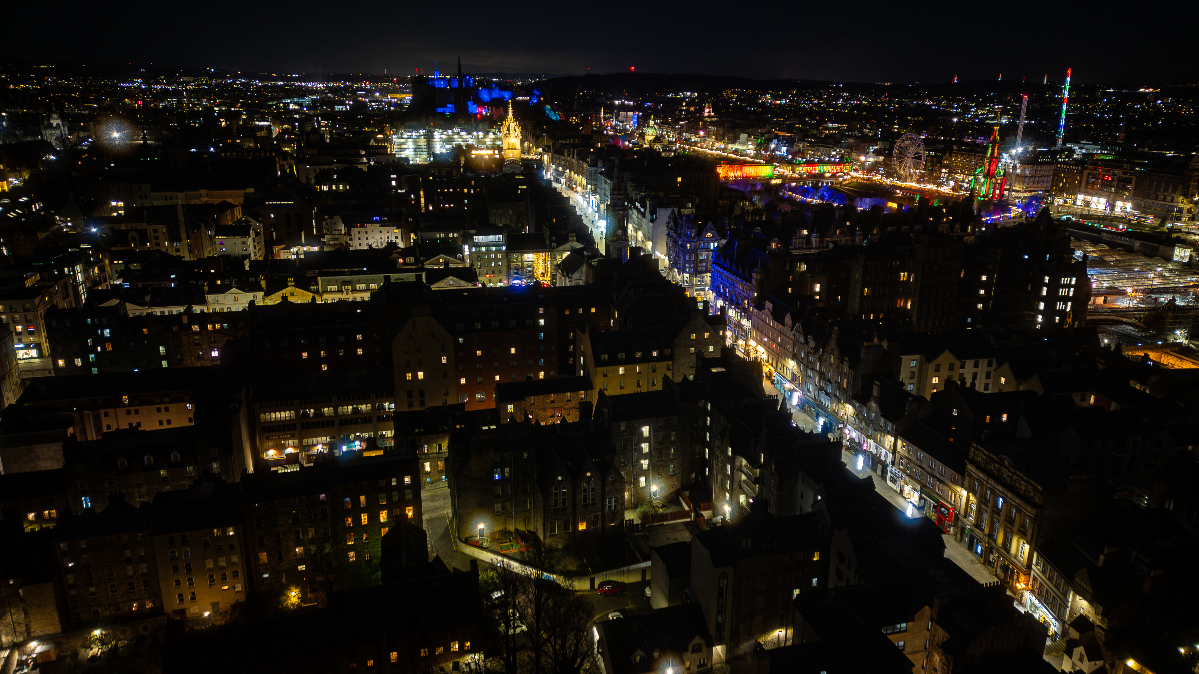 An aerial nighttime view of a city skyline, featuring illuminated buildings, streets, a Ferris wheel, and amusement rides against a dark sky in Edinburgh, Scotland.