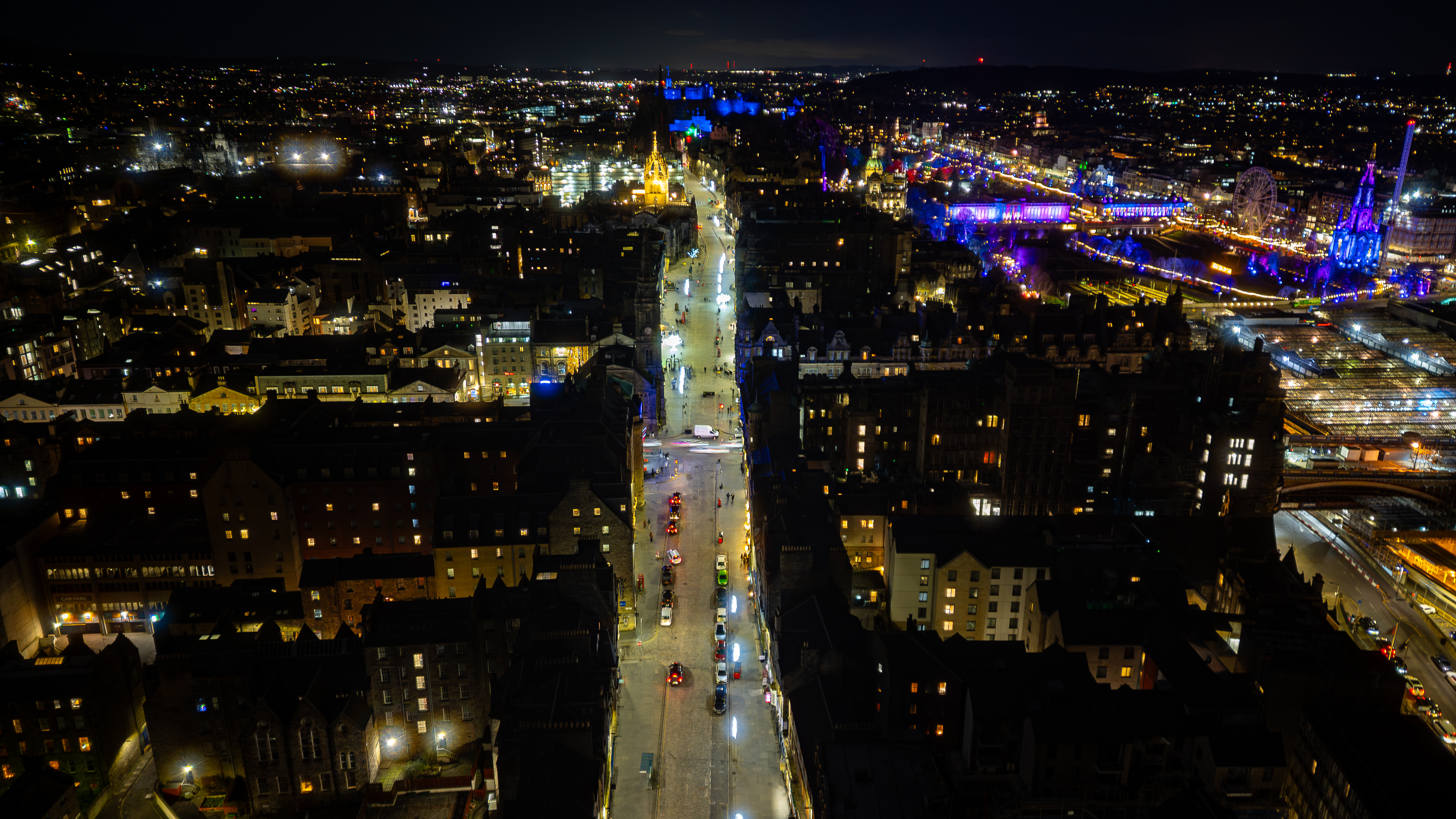 An aerial, nighttime view of a city street lined with dark buildings, illuminated by streetlights and colorful festival lights in the distance in Edinburgh, Scotland.