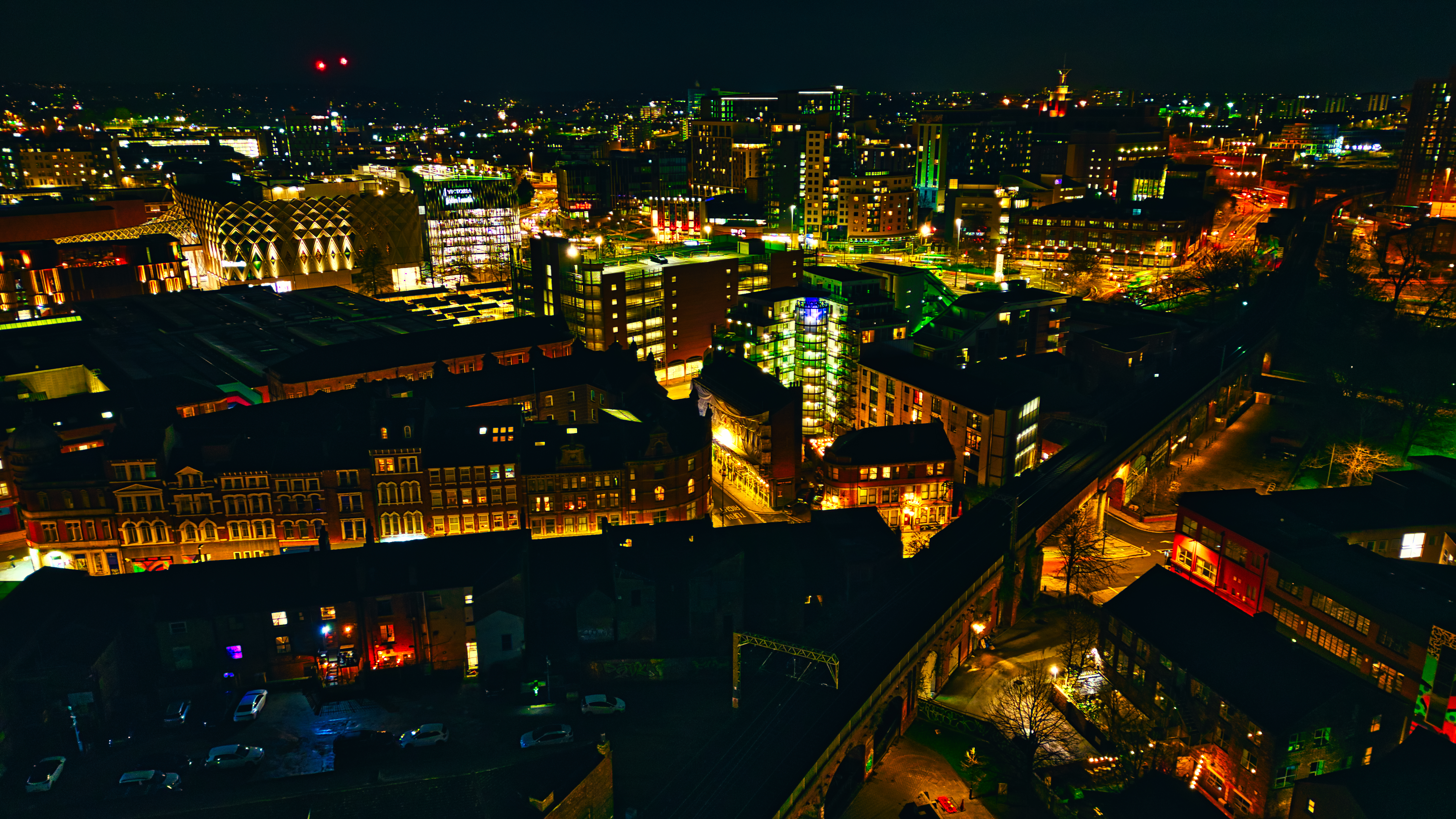Cityscape at night with illuminated buildings and streets in Leeds, UK.