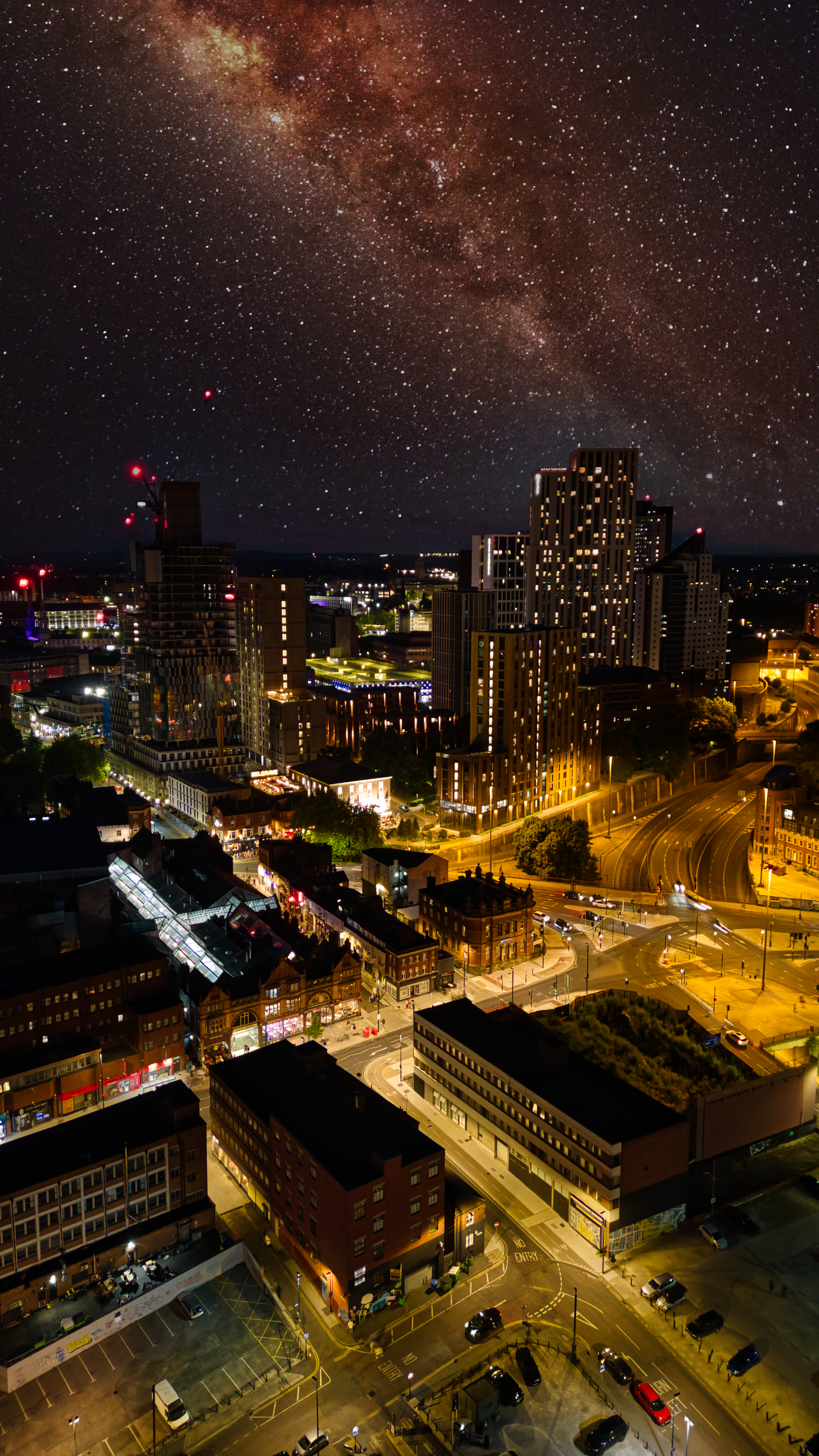 Cityscape at night with illuminated buildings under a starry sky in Leeds.