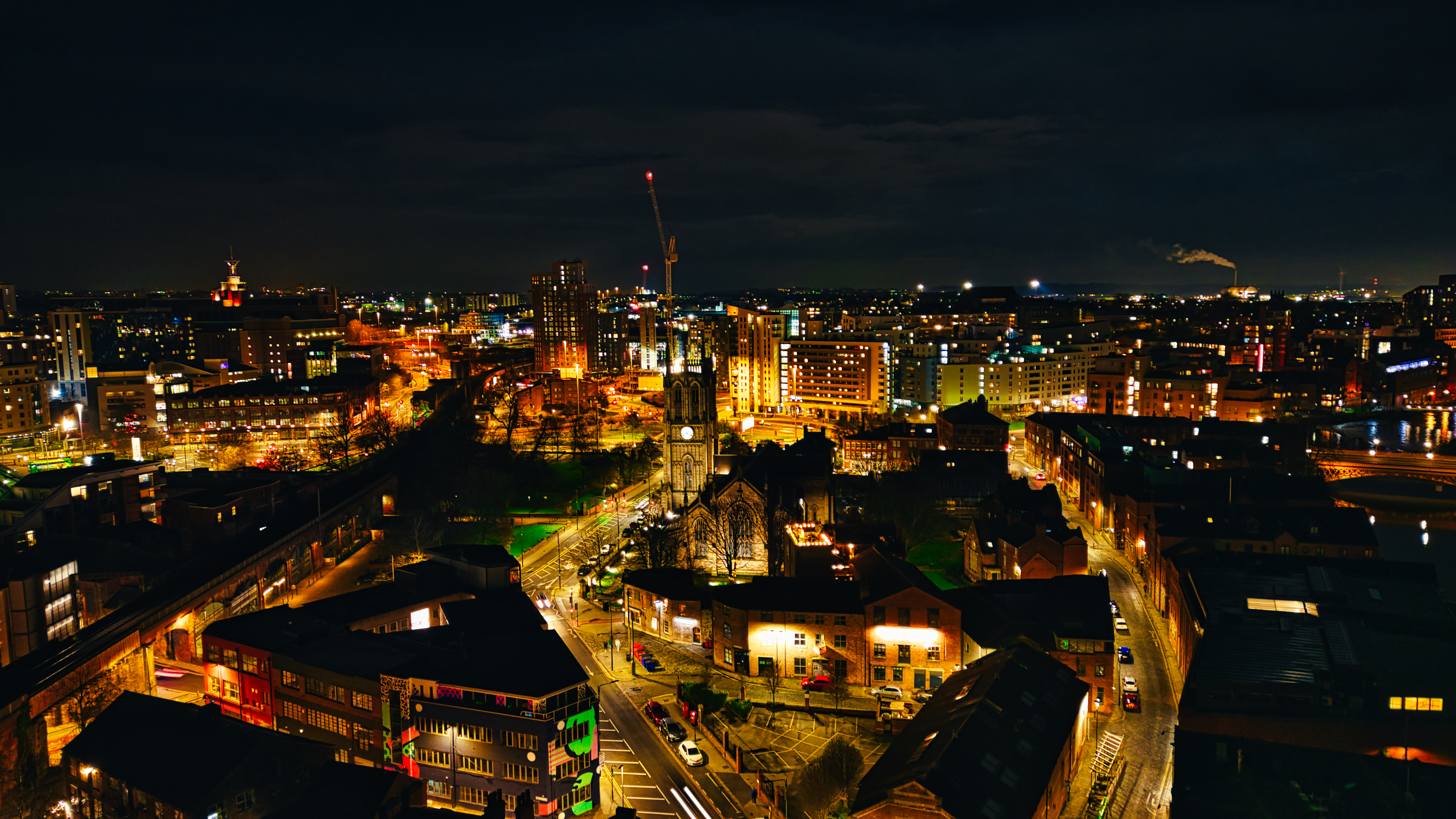 Cityscape at night with illuminated streets and buildings, showcasing urban nightlife and architecture in Leeds, UK.