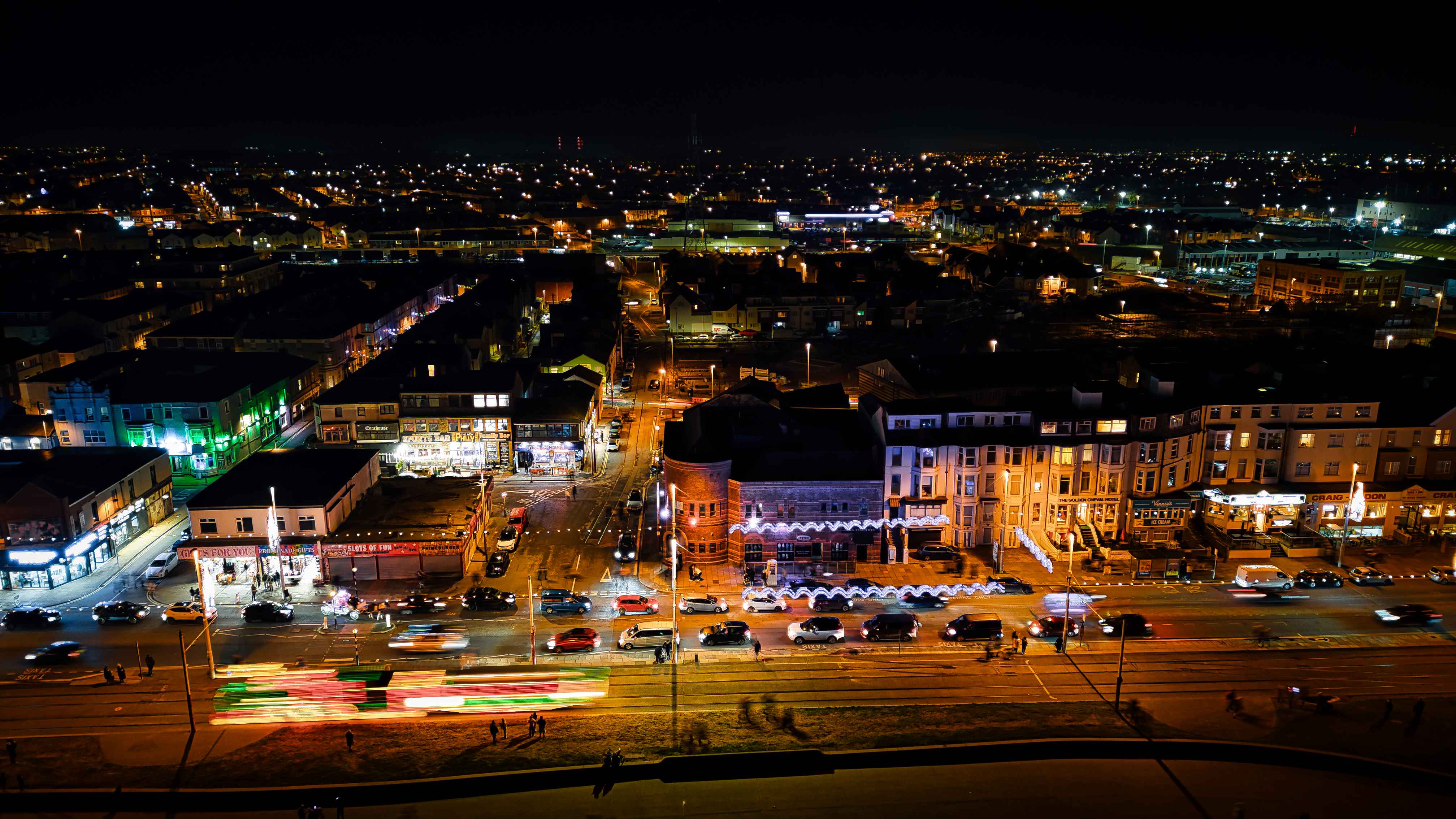 Cityscape at night with illuminated streets and moving vehicles, showcasing urban nightlife and traffic in Backpool, England.