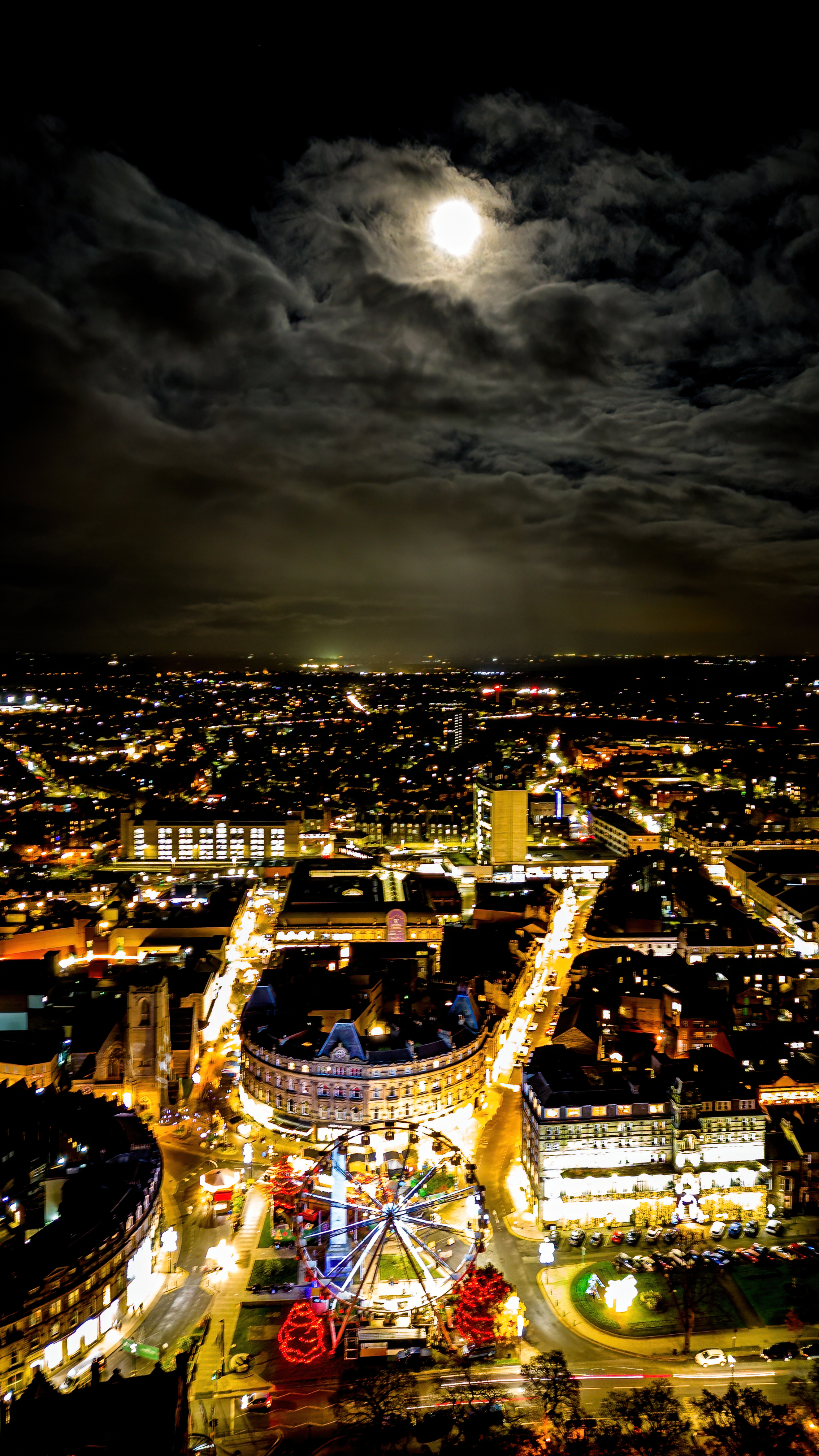 Cityscape at night with illuminated streets under a full moon in Harrogate, North Yorkshire.