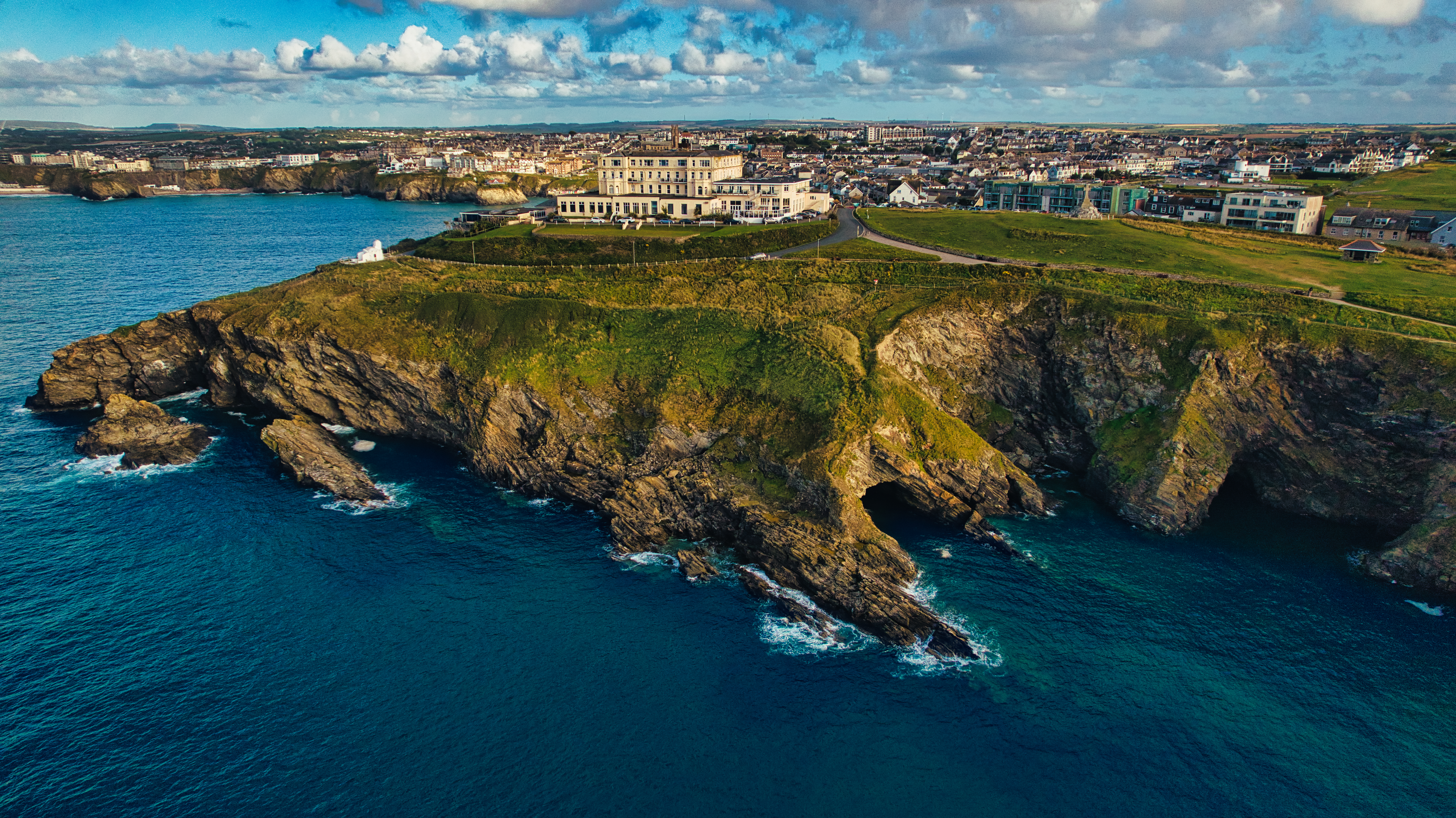 Aerial view of a coastal landscape featuring rugged cliffs, a hotel on the edge, and a vibrant blue sea. The scene captures the beauty of nature with a mix of greenery and rocky formations, under a partly cloudy sky.