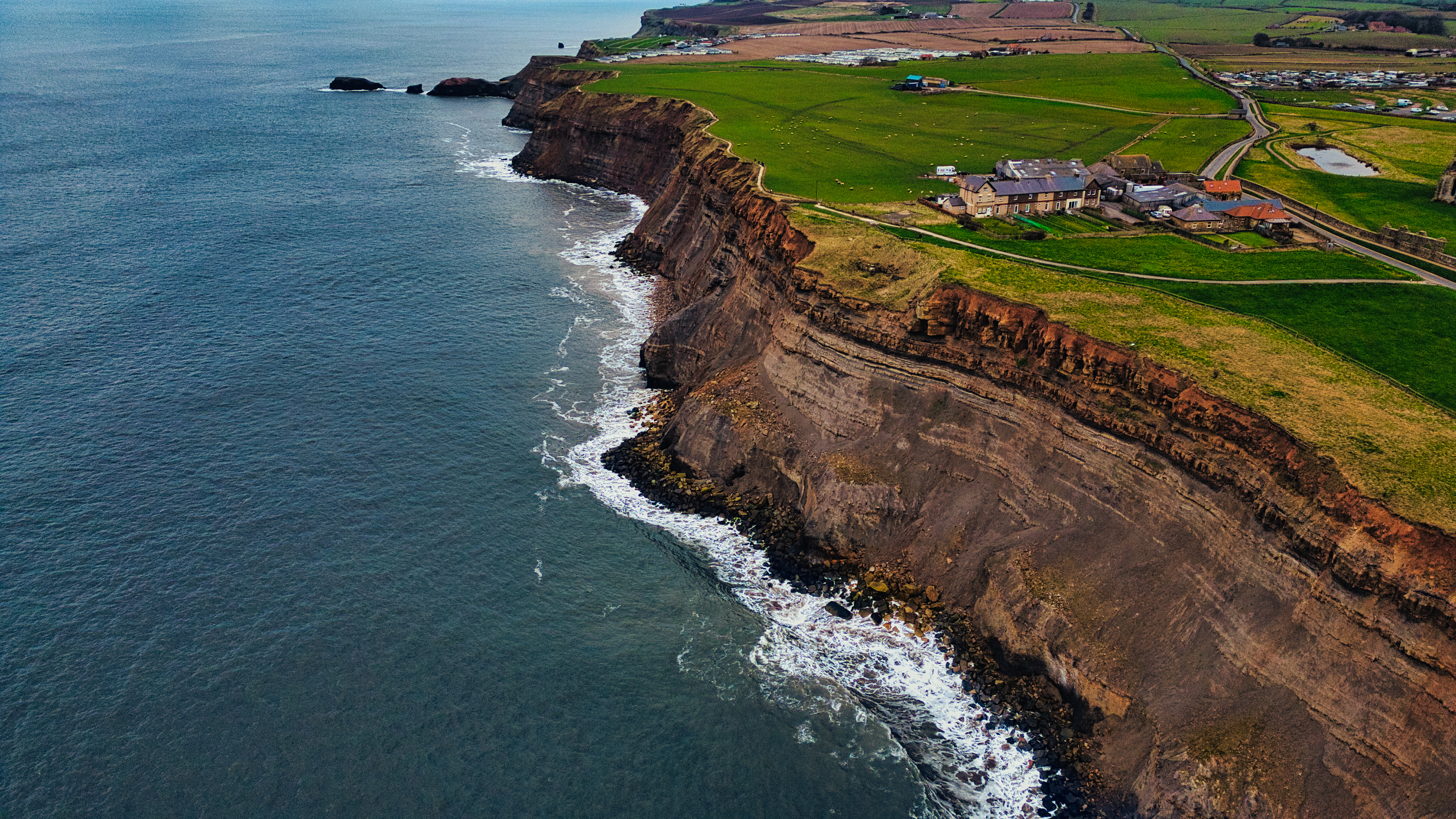 Aerial view of a layered coastal cliff meeting the ocean, topped with green fields and buildings in Whitby, UK.